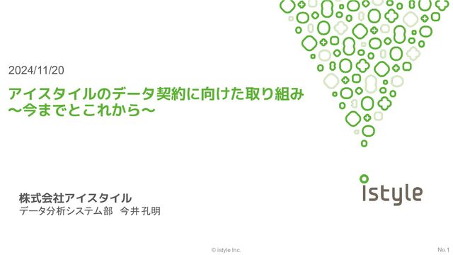 © istyle Inc. 1 アイスタイルのデータ契約に向けた取り組み ~今までとこれから~ No.1 株式会社アイスタイル データ分析システム部 今井 孔明