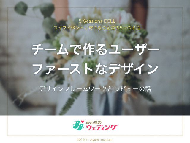 チームで作るユーザーファーストなデザイン〜デザインフレームワークとレビューの話〜 2016年11月28日に開催された『5 Sessions DELI. ライフイベントに寄り添う企業の5つのお話』の登壇資料です。 みんなのウェディングのUXデザイン部が、どんな風にチームでデザインをしているかをご紹介します。