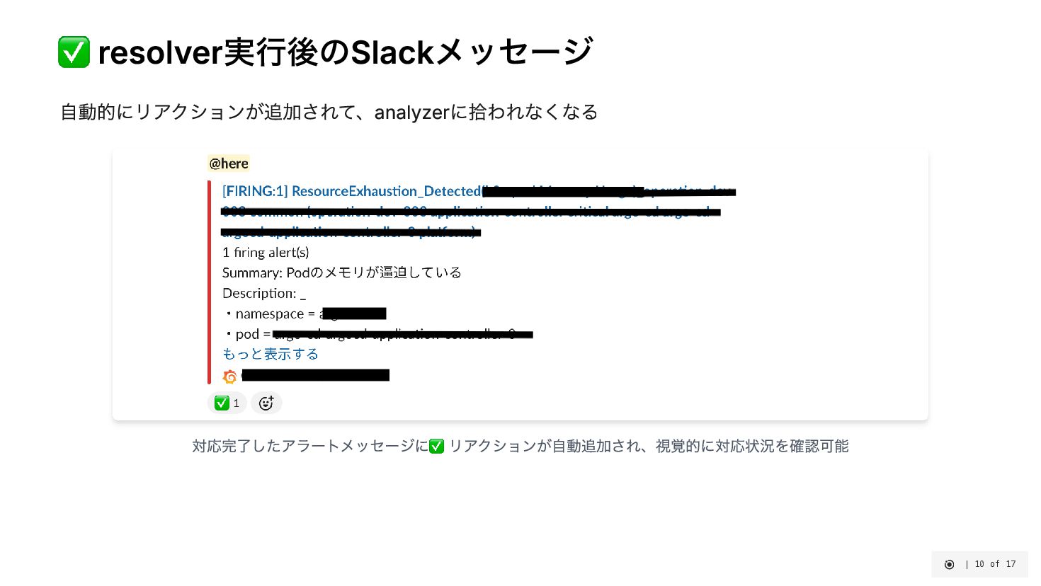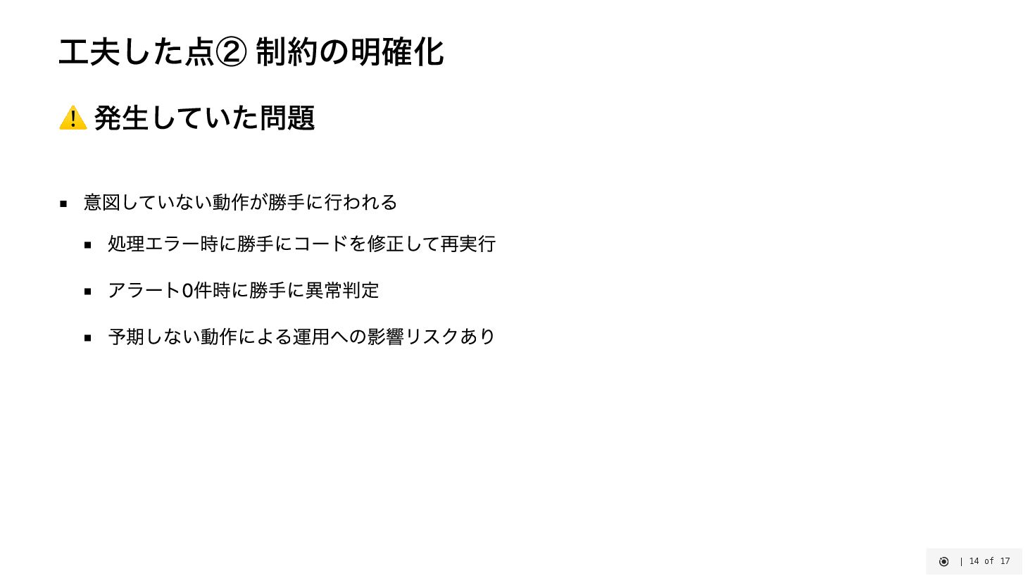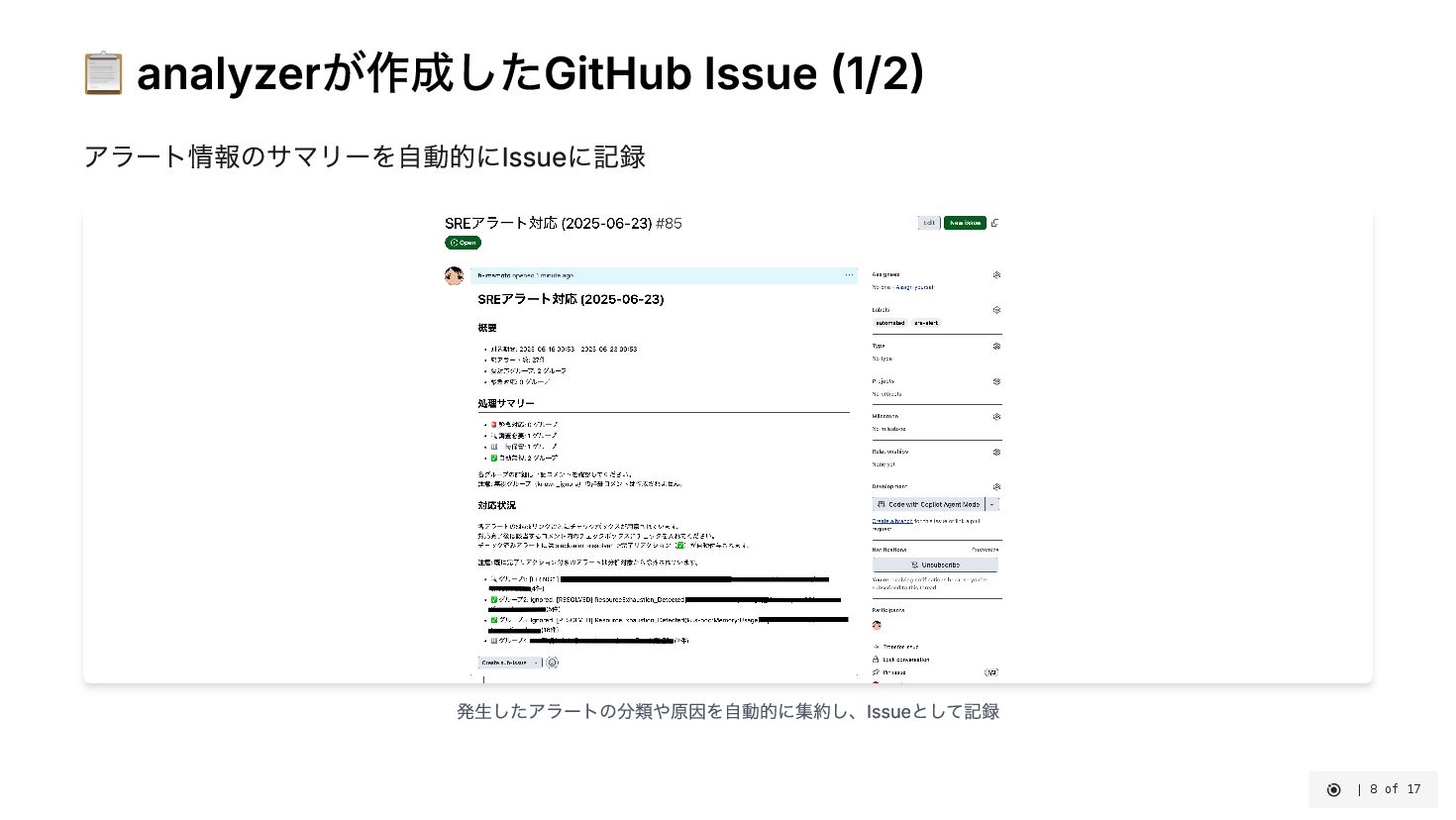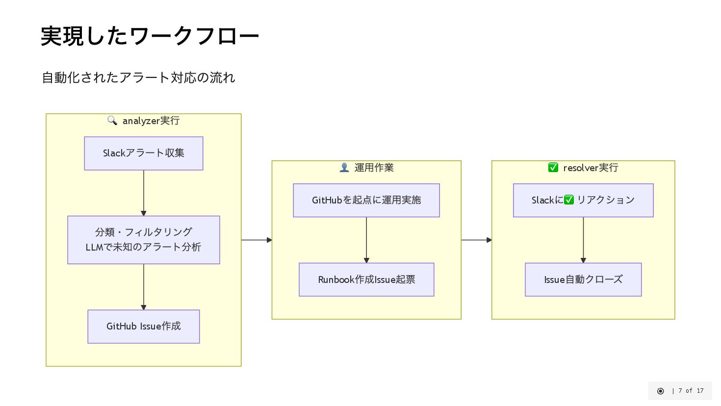 対応状況の記録 解決したかった困りごと 🔍 1. 見落とし・対応漏れのリスク 📊 2. 横展開の必要性 👥 3. 対応の属人化 Slackチャンネルを目視確認しているが、 「どのアラートまで確認済みか」 の管理が不十分で非効率。見落としリスクもある SRE課以外でスプレッドシートでアラート情報を管理しているという事例 あり。何らかの仕組みで管理を楽にして横展開したい。 アラートメッセージを見て対応方法を決定する際、習熟度による対応速 度の差が発生し、アラート対応が属人化してしまう。 | 4 of 17