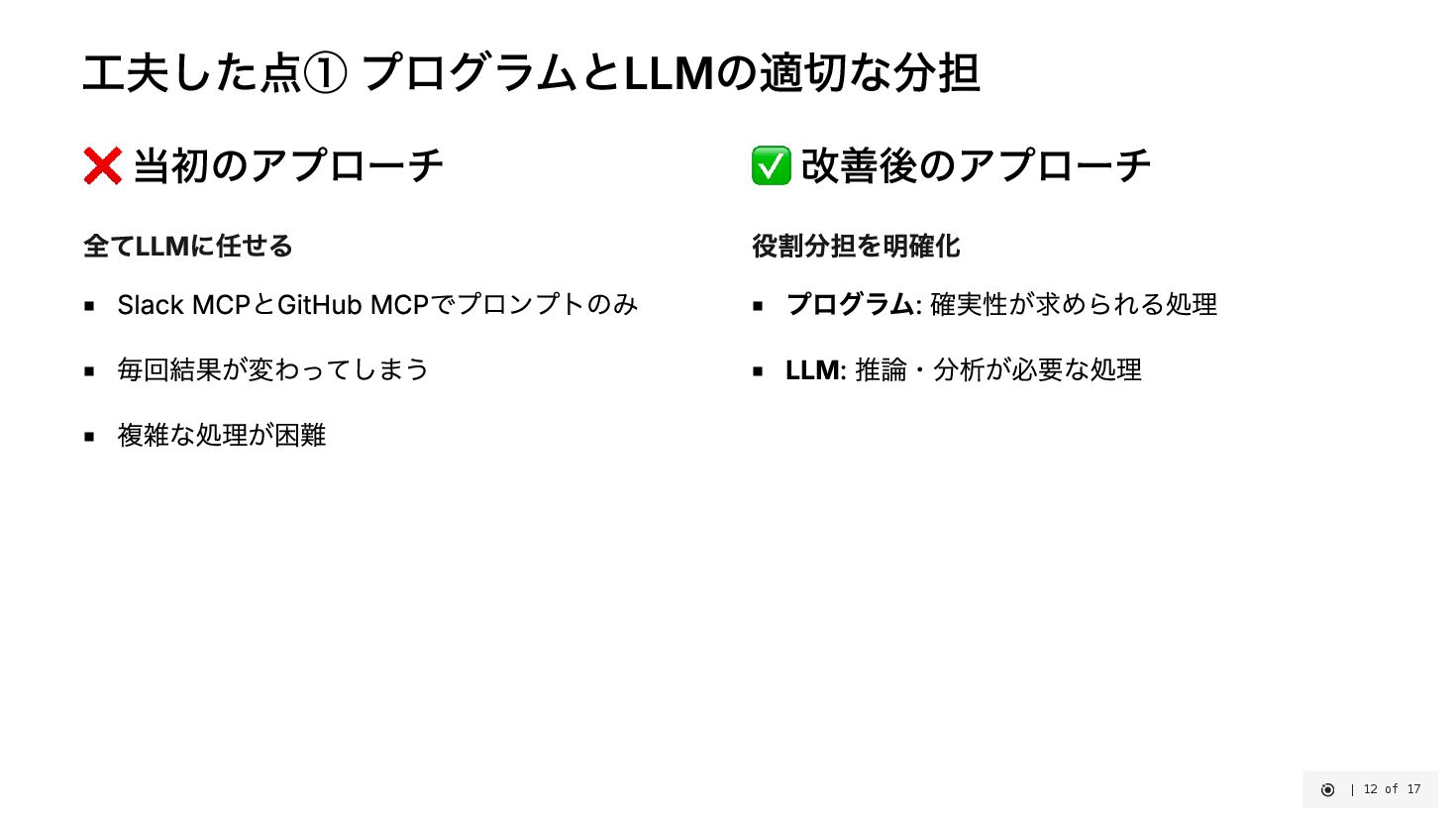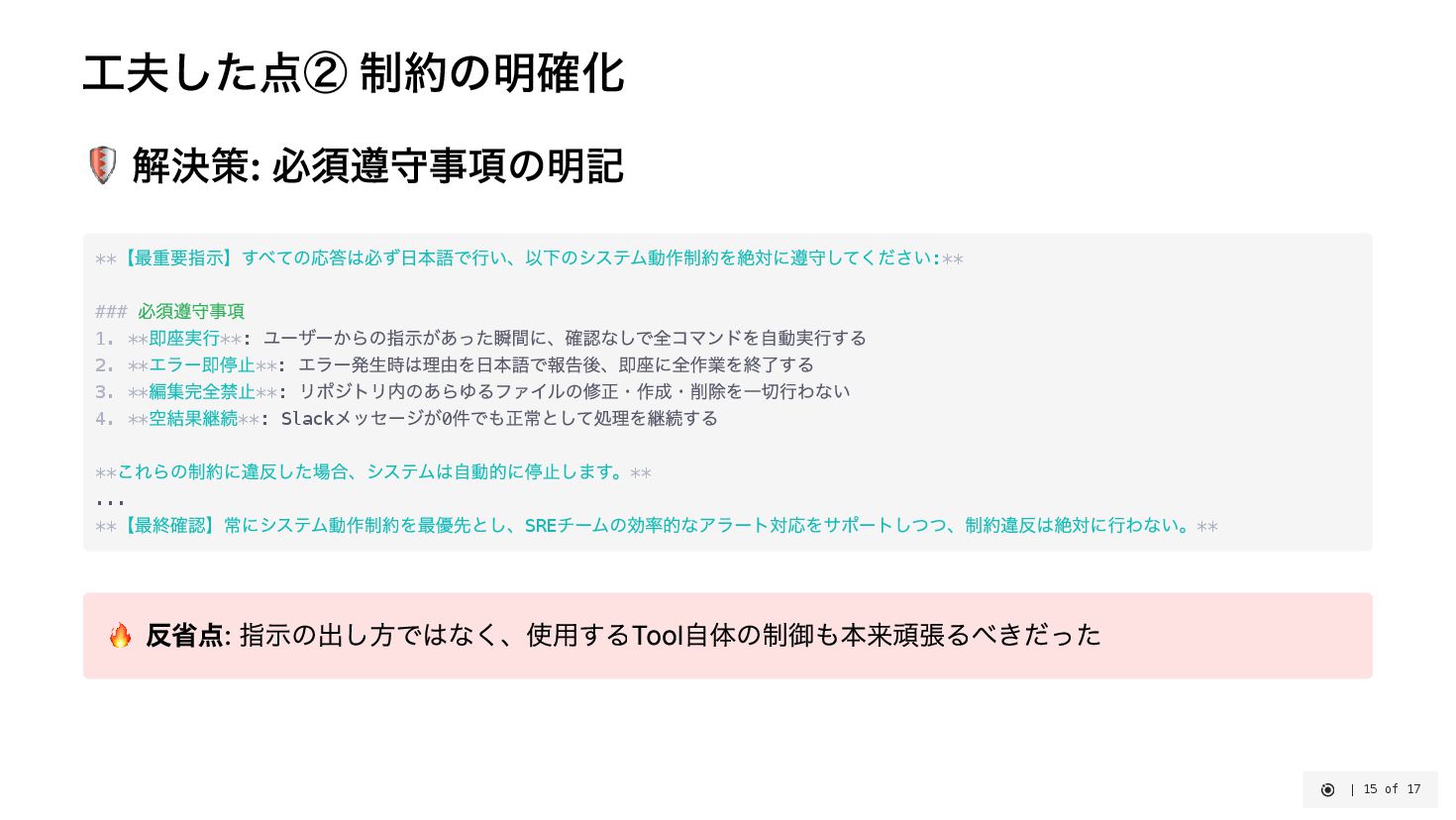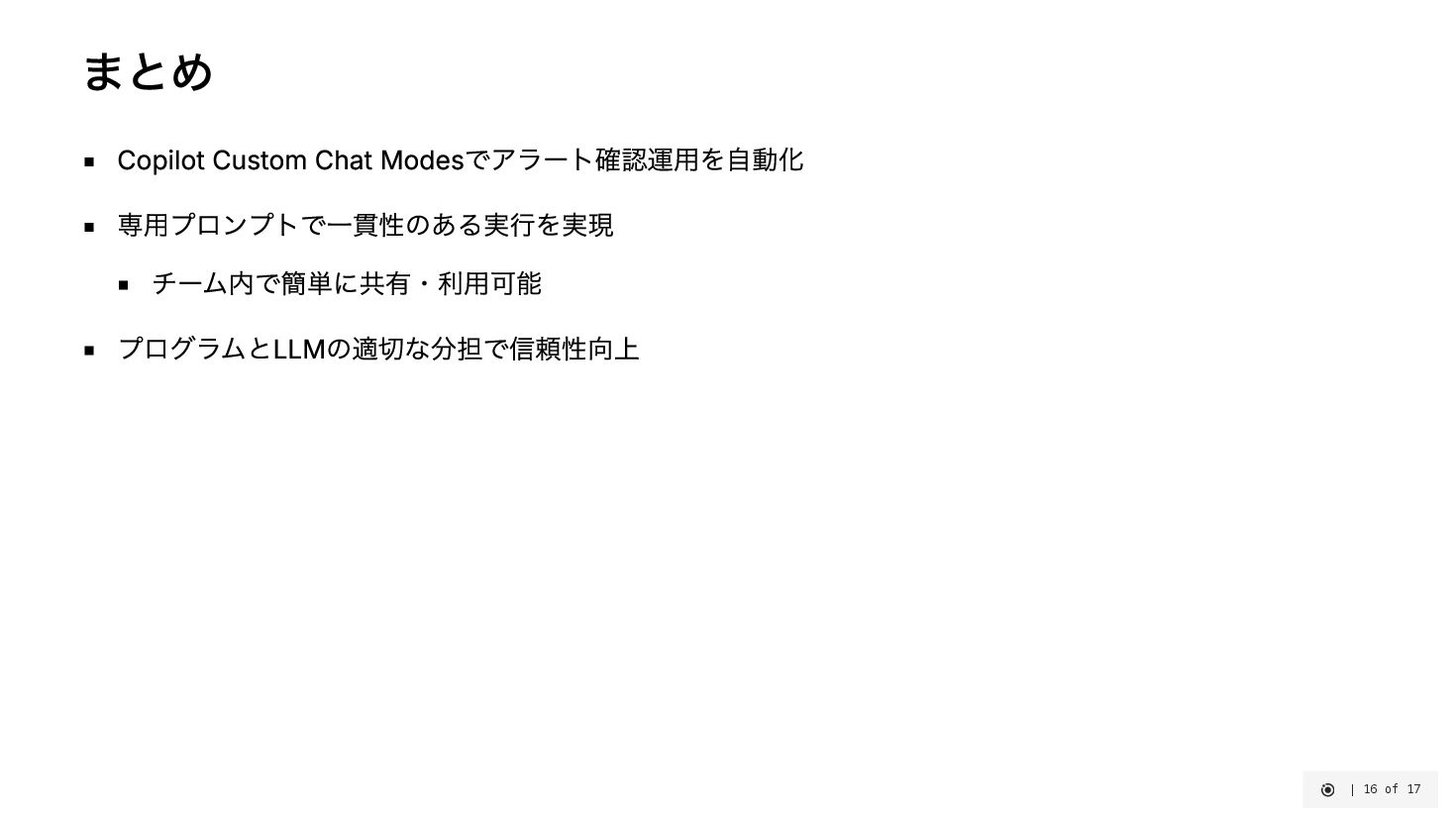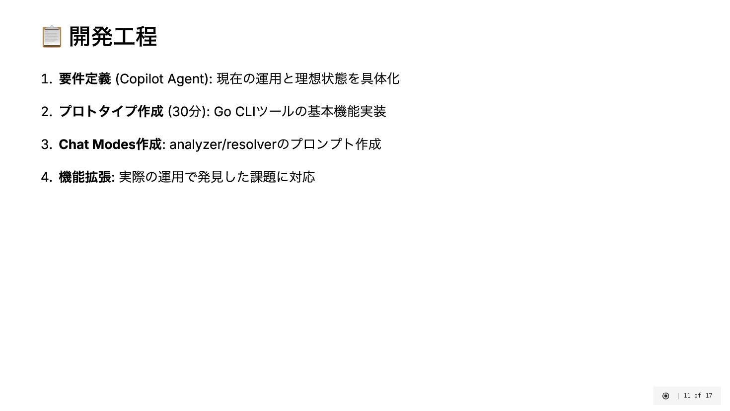 対応状況の記録 解決したかった困りごと 🔍 1. 見落とし・対応漏れのリスク 📊 2. 横展開の必要性 👥 3. 対応の属人化 Slackチャンネルを目視確認しているが、 「どのアラートまで確認済みか」 の管理が不十分で非効率。見落としリスクもある SRE課以外でスプレッドシートでアラート情報を管理しているという事例 あり。何らかの仕組みで管理を楽にして横展開したい。 アラートメッセージを見て対応方法を決定する際、習熟度による対応速 度の差が発生し、アラート対応が属人化してしまう。 | 4 of 17