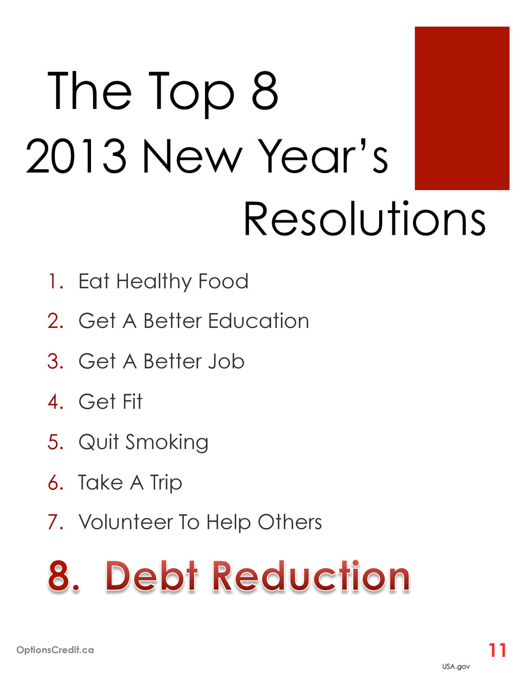 Get A Better Job 4. Get Fit 5. Quit Smoking 6. Take A Trip 7. Volunteer To Help Others 2013 New Year’s Resolutions USA.gov OptionsCredit.ca 11 The Top 8