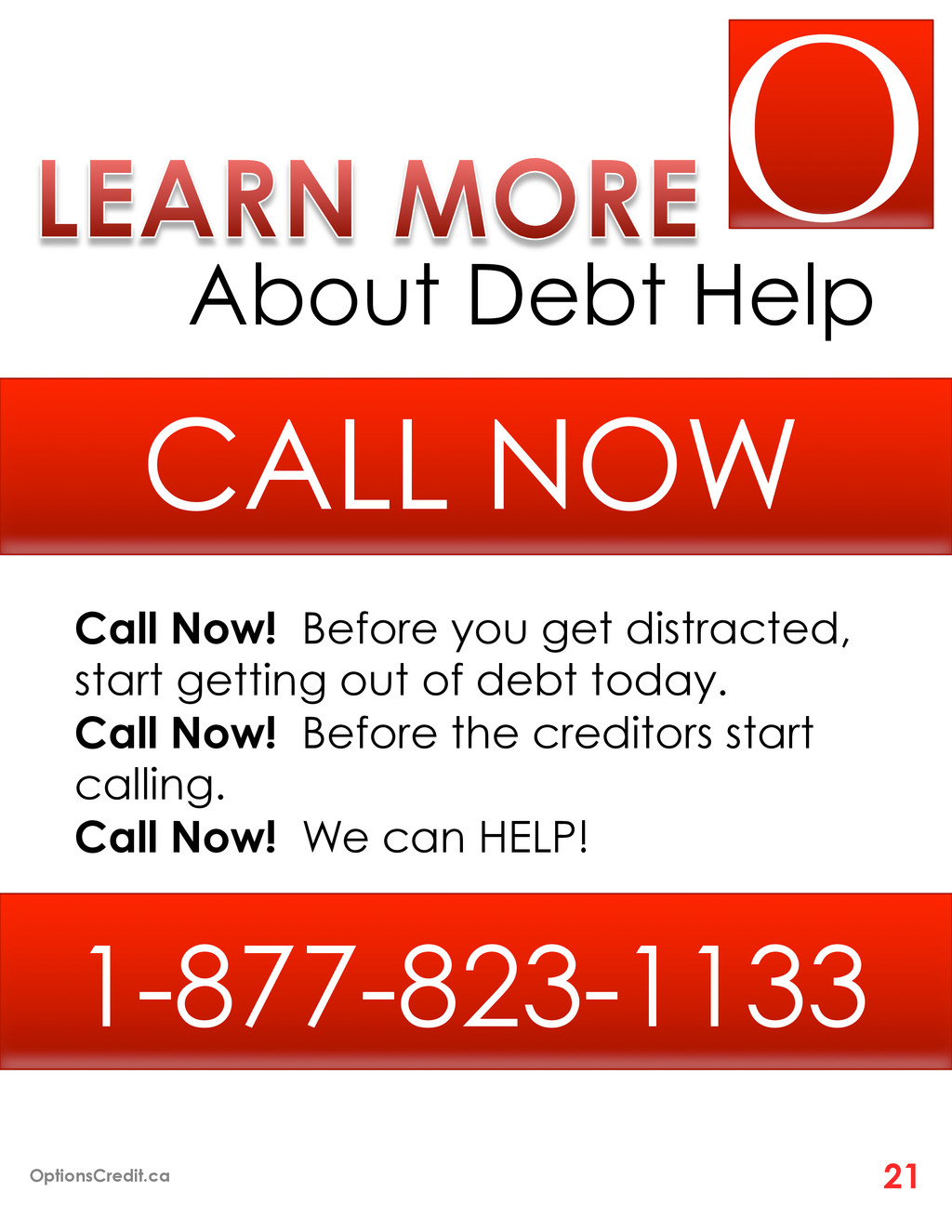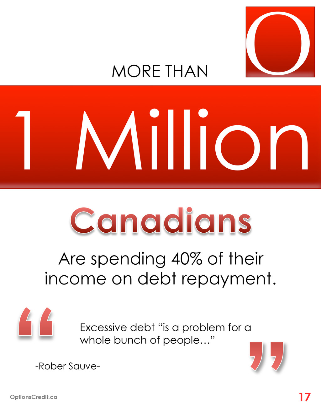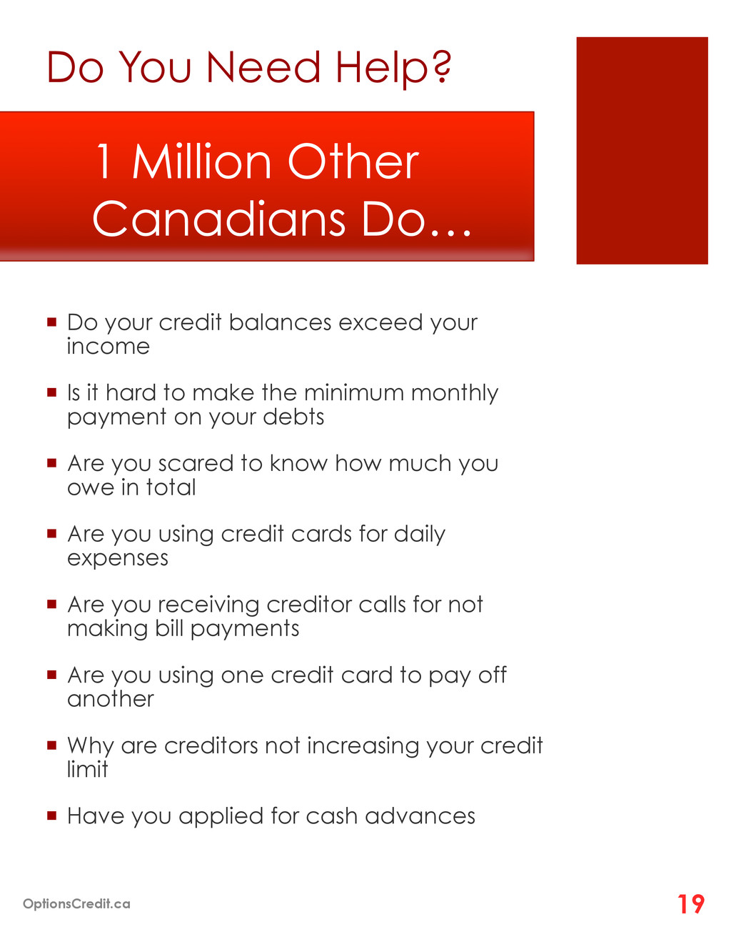your income ¡ Is it hard to make the minimum monthly payment on your debts ¡ Are you scared to know how much you owe in total ¡ Are you using credit cards for daily expenses ¡ Are you receiving creditor calls for not making bill payments ¡ Are you using one credit card to pay off another ¡ Why are creditors not increasing your credit limit ¡ Have you applied for cash advances 1 Million Other Canadians Do… OptionsCredit.ca 19