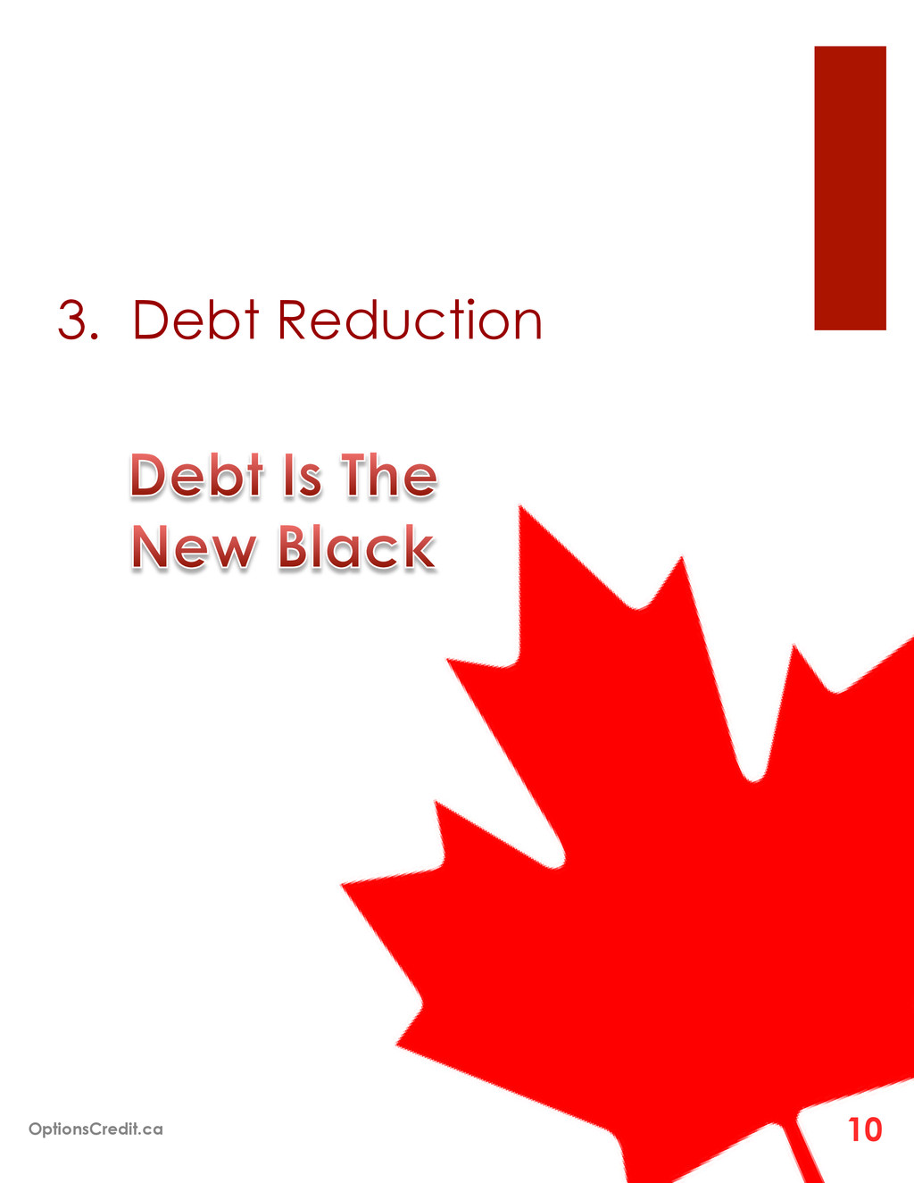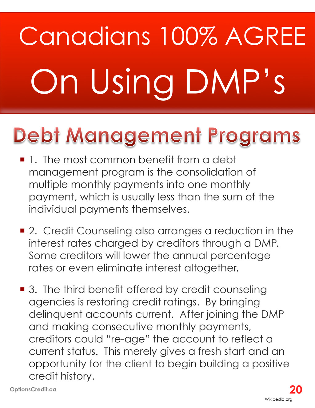program is the consolidation of multiple monthly payments into one monthly payment, which is usually less than the sum of the individual payments themselves. ¡ 2. Credit Counseling also arranges a reduction in the interest rates charged by creditors through a DMP. Some creditors will lower the annual percentage rates or even eliminate interest altogether. ¡ 3. The third benefit offered by credit counseling agencies is restoring credit ratings. By bringing delinquent accounts current. After joining the DMP and making consecutive monthly payments, creditors could “re-age” the account to reflect a current status. This merely gives a fresh start and an opportunity for the client to begin building a positive credit history. Canadians 100% AGREE On Using DMP’s Wikipedia.org OptionsCredit.ca 20