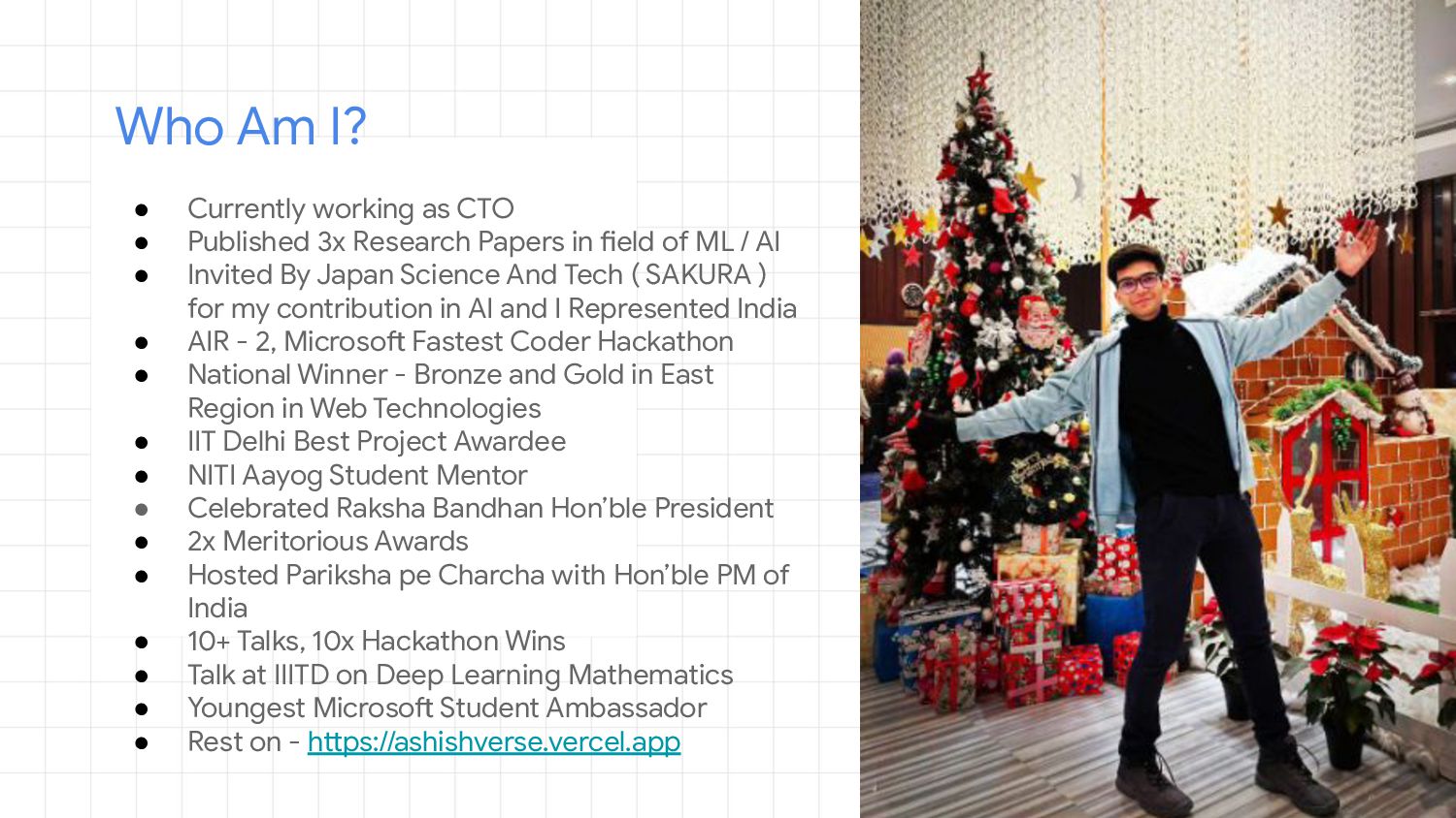 3x Research Papers in field of ML / AI • Invited By Japan Science And Tech ( SAKURA ) for my contribution in AI and I Represented India • AIR - 2, Microsoft Fastest Coder Hackathon • National Winner - Bronze and Gold in East Region in Web Technologies • IIT Delhi Best Project Awardee • NITI Aayog Student Mentor • Celebrated Raksha Bandhan Hon’ble President • 2x Meritorious Awards • Hosted Pariksha pe Charcha with Hon’ble PM of India • 10+ Talks, 10x Hackathon Wins • Talk at IIITD on Deep Learning Mathematics • Youngest Microsoft Student Ambassador • Rest on - https://ashishverse.vercel.app