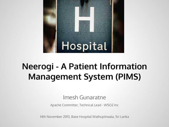 Thusith Gunawardane. ➔ It was developed in my free time. ➔ We named it Neerogi. The name might change. ➔ Published on the internet as an open source software project: http://github.com/neerogi ➔ Initially being used at Base Hospital Wathupitiwala, Sri Lanka.