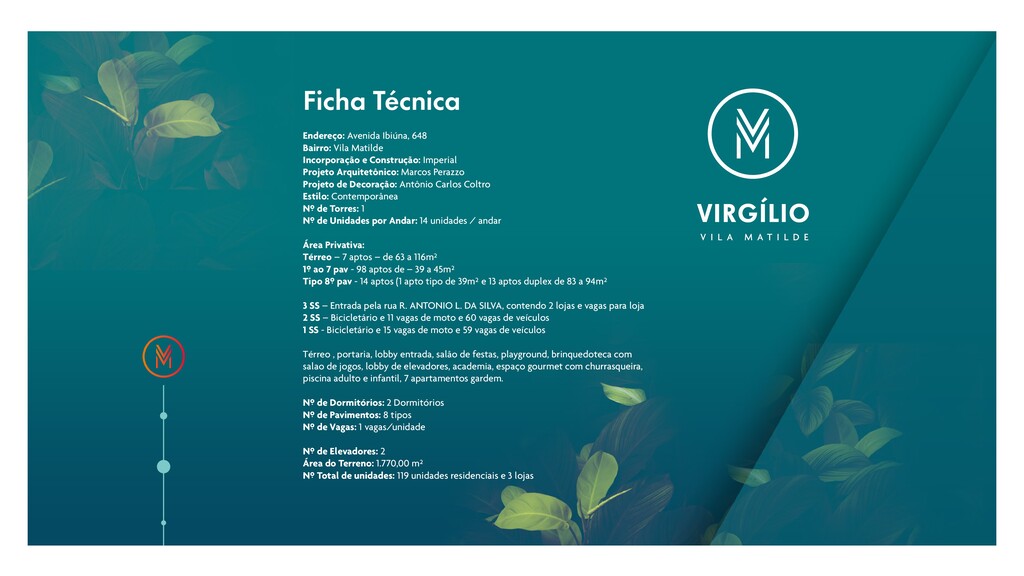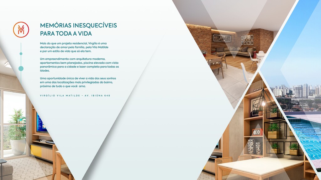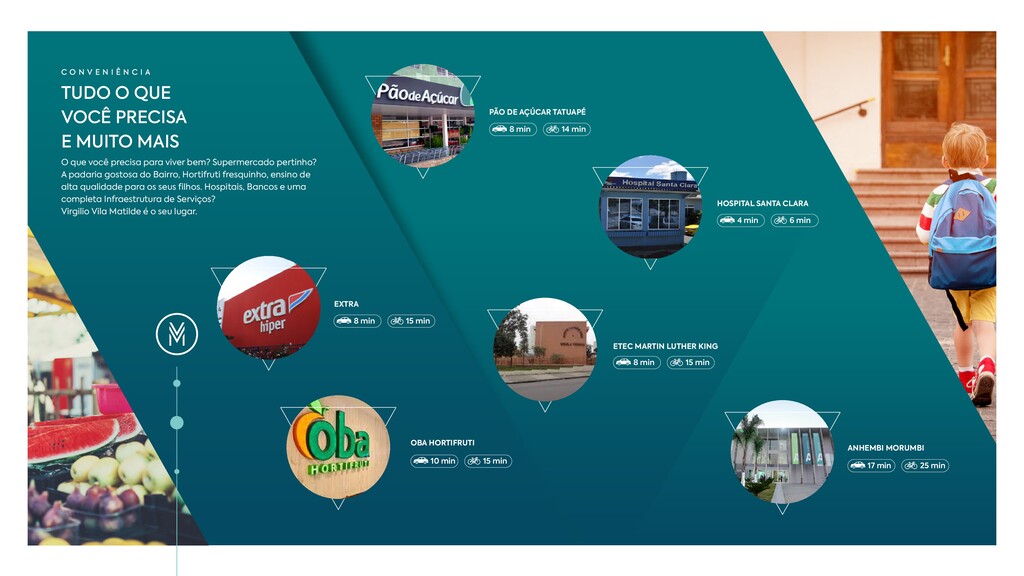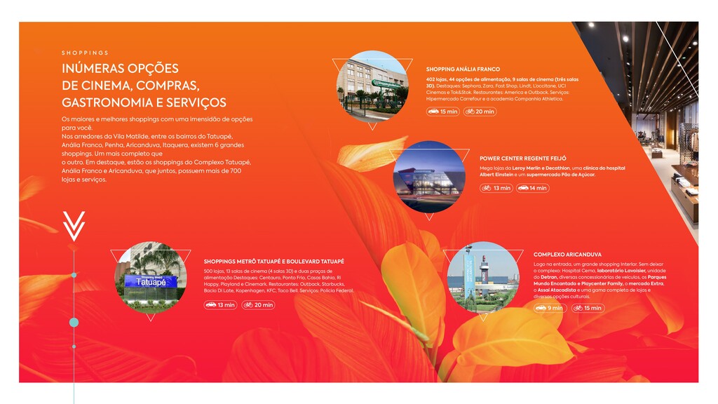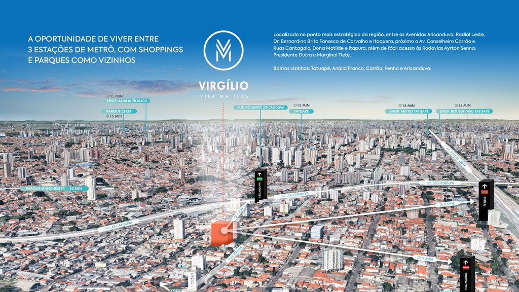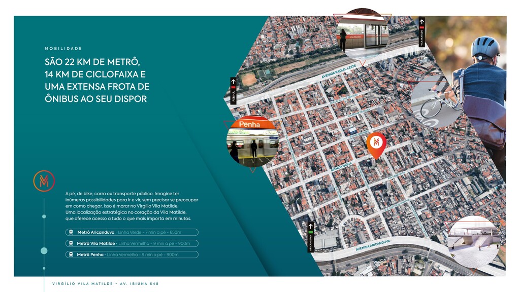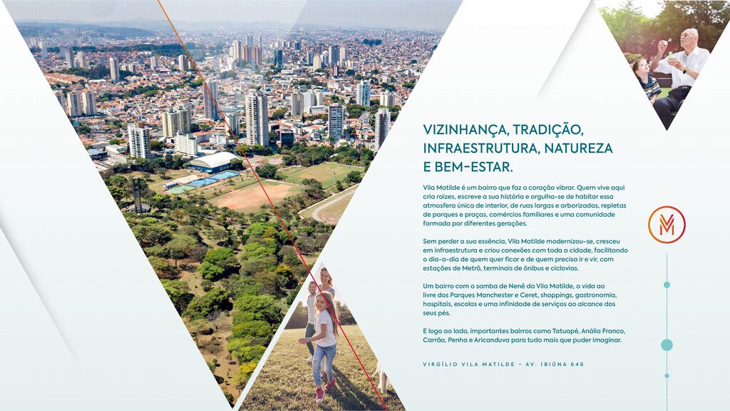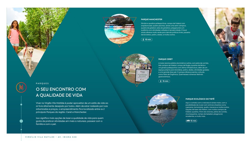 L A M A T I L D E - A V . I B I U N A 6 4 8 O SEU ENCONTRO COM A QUALIDADE DE VIDA Viver no Virgílio Vila Matilde é poder aproveitar de um estilo de vida ao ar livre altamente desejado por todos. Além de estar rodeado por ruas arborizadas e praças, o empreendimento fica localizado entre os 2 principais Parques da região: Ceret e Manchester. Isso significa mais opções de lazer e qualidade de vida para quem gosta de praticar atividades em meio a natureza, passear com a família e com o pet. P A R Q U E S PARQUE MANCHESTER Ginásio e quadras poliesportivas, campo de futebol com arquibancada, quatro piscinas, sendo uma semi-olímpica, quadra de gatebol, salas de ginástica, playground e um auditório com atividades voltadas à terceira idade. O local ainda oferece muito verde para demais práticas livres, passeios de bicicletas, patins, skates, e muitos outros. 10 min PARQUE CERET A maior piscina pública da América Latina, com pista de corrida, três campos de futebol, campo de Rugby, quadras de tênis e um ginásio poliesportivo com ótima infraestrutura, além de um espaço próprio para bicicletas, patins, skates, atividades guiadas e uma grande área pet. O parque oferece eventos culturais, como Feira de Orgânicos, Quermesses e diversos festivais gastronômicos. 15 min PARQUE ECOLÓGICO DO TIETÊ Aqui o contato com a natureza é ainda maior, com a possibilidade de cruzar com animais silvestres como capivaras, tamanduás, quatis, macacos e muitos outros. Opções de lazer não faltam, com muitos campos de futebol, quadras, 14 km de ciclovias, pistas de corrida, churrasqueiras, campo de beisebol, playground, academias, e muito mais. 15 min