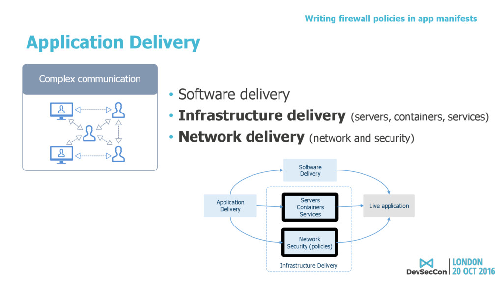 • Software delivery • Infrastructure delivery (servers, containers, services) • Network delivery (network and security) Every part of the process need to be validated and reviewed by people, generating bottlenecks • DevOps to the rescue