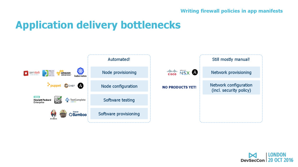 • Software delivery • Infrastructure delivery (servers, containers, services) • Network delivery (network and security) Every part of the process need to be validated and reviewed by people, generating bottlenecks • DevOps/NetOps to the rescue Security validations and compliance of infrastructure delivery • ¿?