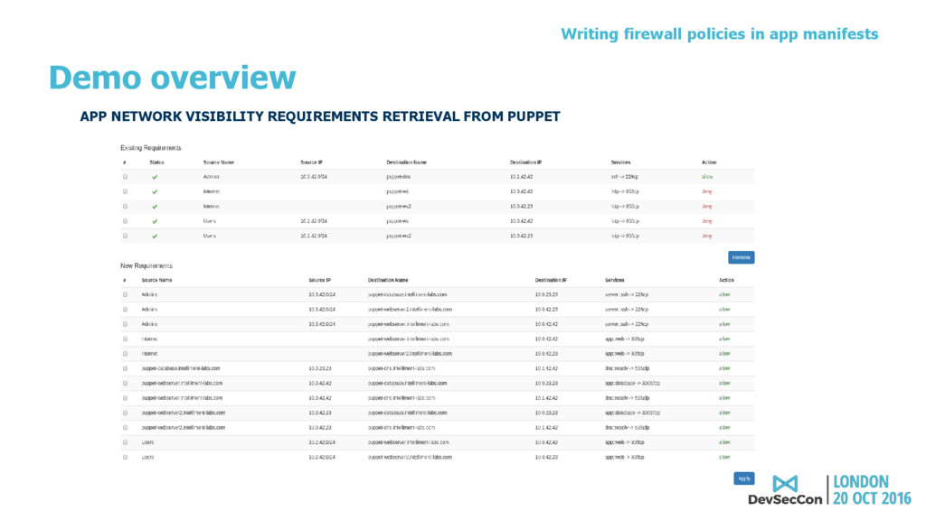 to the left” paradigm • Define your network needs as code Just say what you want Writing firewall policies in app manifests • Application Delivery • SecOps • Define your compliance as code • Risk I need to consume SNMP servers I will provide a service by tcp 443 and tcp80 Firewall policies as code! User network must have visibility to App server DMZ traffic must be limited to Internet by tcp 443 and tcp80