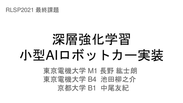 深層強化学習 小型AIロボットカー実装 東京電機大学 M1 長野 紘士朗 東京電機大学 B4 池田柳之介 京都大学