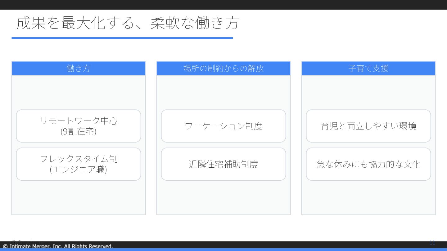 ユニークな福利厚生とコミュニケーション制度 ランチコミュニケーション制度 部署や役職を超えた気軽な交流を会社がサポート(ランチ代補助) 充実の休暇制度 通常の有給に加え、夏季休暇やバースデー休暇・チャレンジ休暇など 定期的な情報共有 オフライン納会やオンライン全社定例MTGを定期的に実施し、リモート下でも一体感を醸成 © Google Inc.