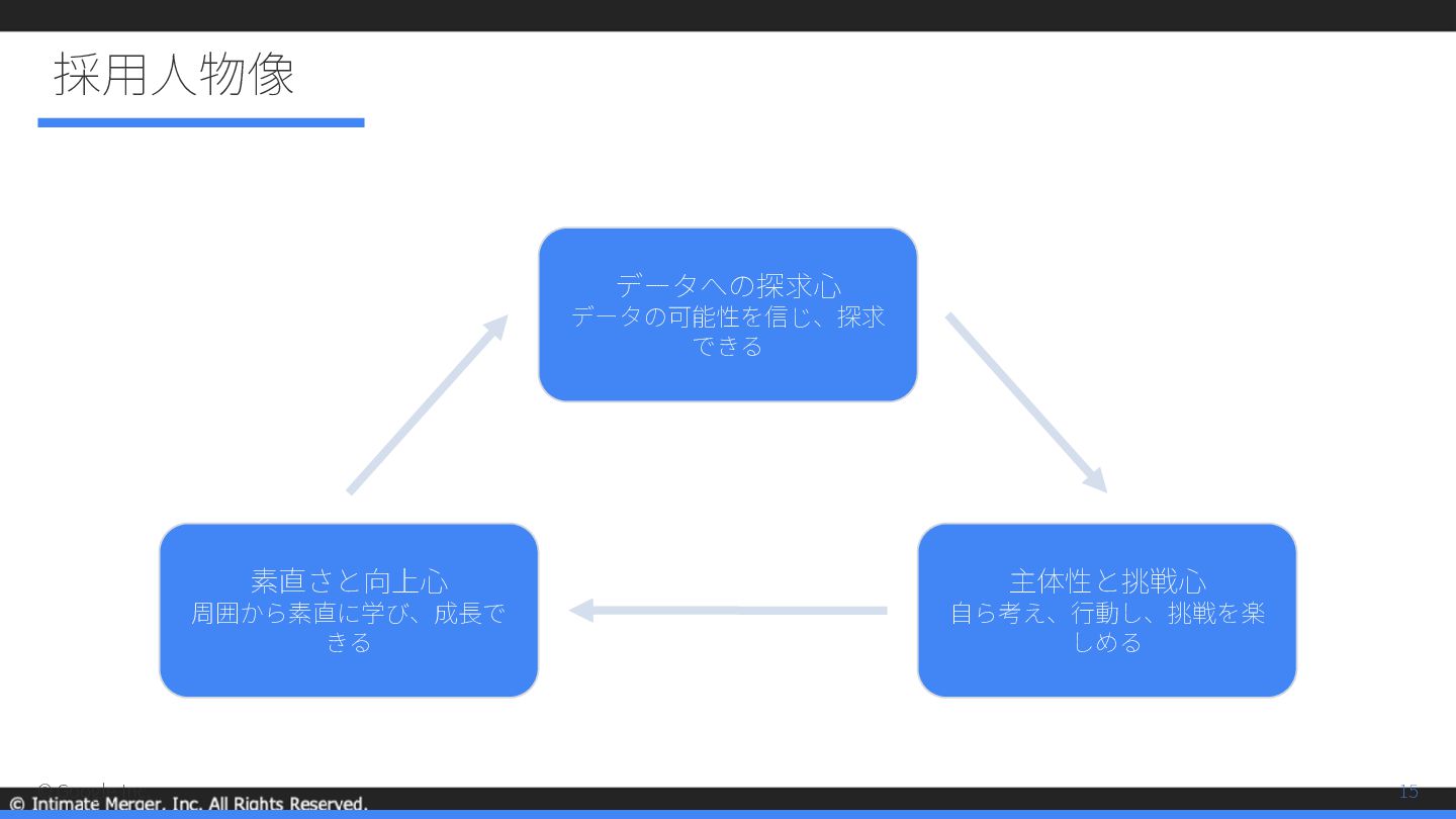 採用人物像 データへの探求心 データの可能性を信じ、探求 できる 主体性と挑戦心 自ら考え、行動し、挑戦を楽 しめる 素直さと向上心 周囲から素直に学び、成長で きる