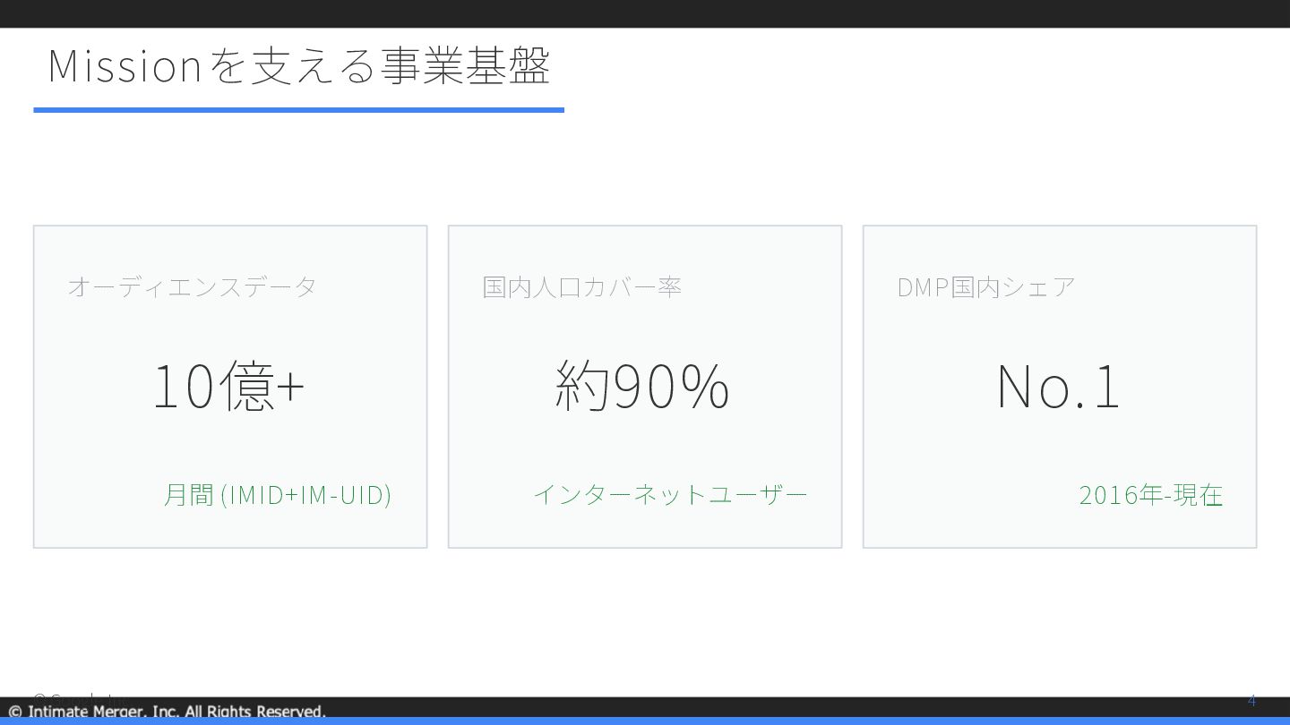 Missionを支える事業基盤 オーディエンスデータ 10億+ 月間 (IMID+IM-UID) 国内人口カバー率 約90% インターネットユーザー DMP国内シェア No.1
