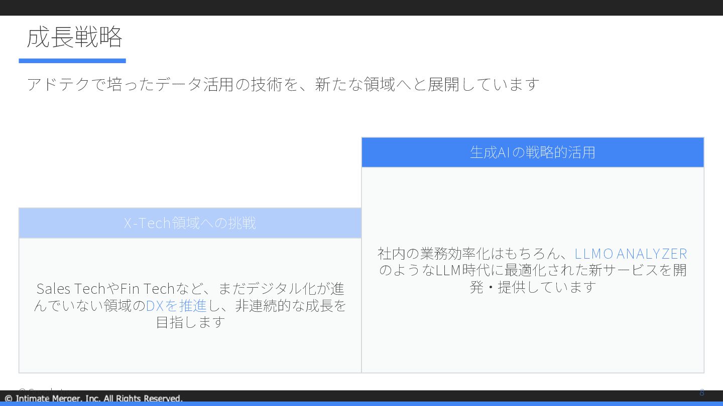 成長戦略 アドテクで培ったデータ活用の技術を、新たな領域へと展開しています X-Tech領域への挑戦 Sales TechやFin Techなど、まだデジタル化が進 んでいない領域のDXを推進し、非連続的な成長を 目指します 生成AIの戦略的活用 社内の業務効率化はもちろん、LLMO