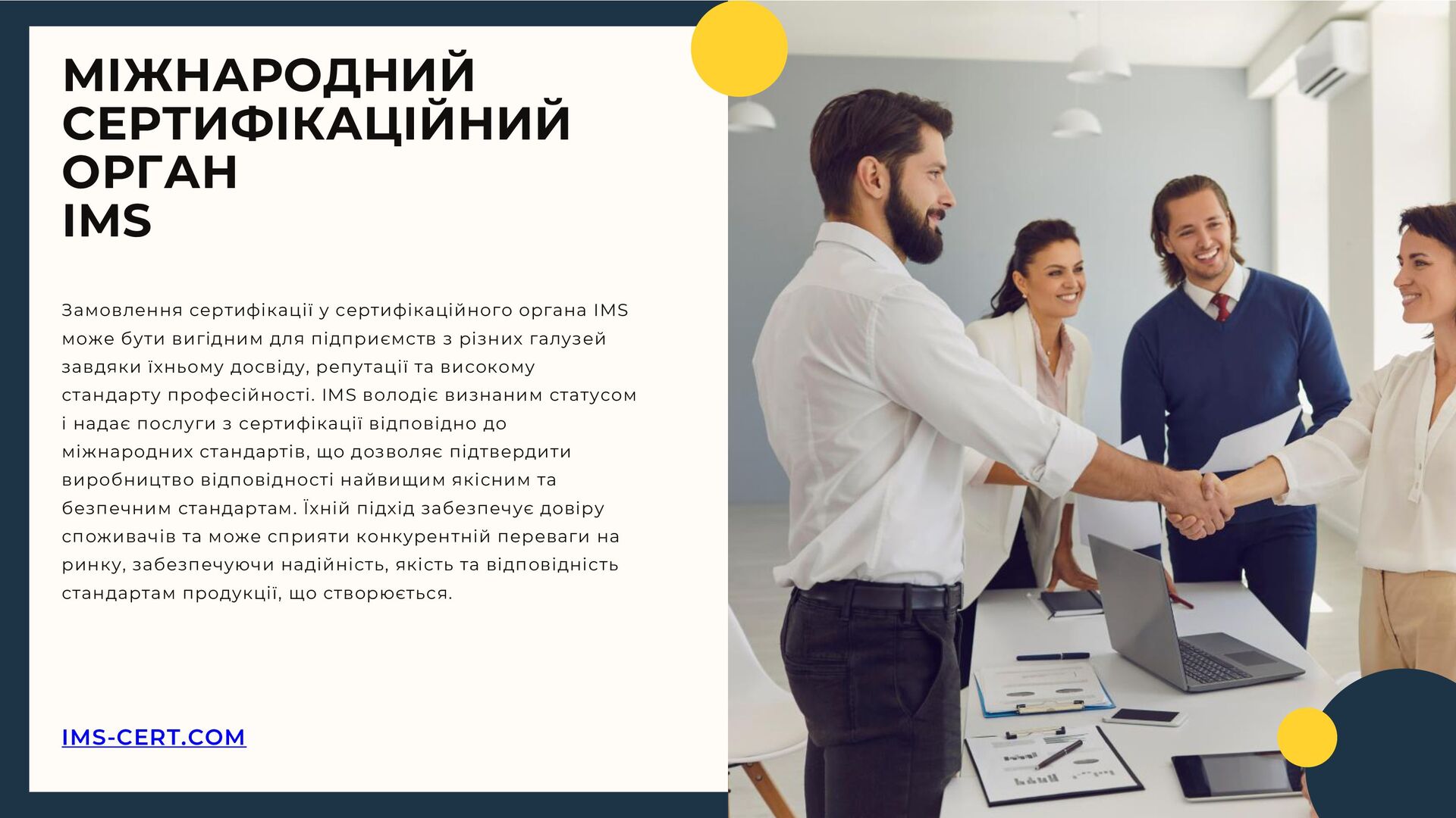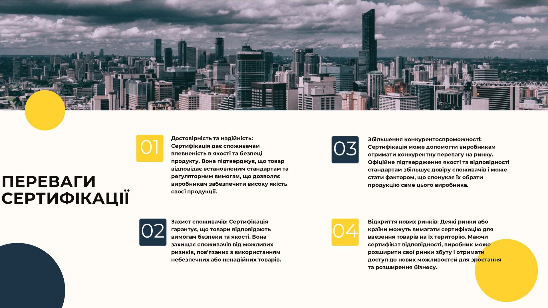 якості та безпеці продукту. Вона підтверджує, що товар відповідає встановленим стандартам та регуляторним вимогам, що дозволяє виробникам забезпечити високу якість своєї продукції. Збільшення конкурентоспроможності: Сертифікація може допомогти виробникам отримати конкурентну перевагу на ринку. Офіційне підтвердження якості та відповідності стандартам збільшує довіру споживачів і може стати фактором, що спонукає їх обрати продукцію саме цього виробника. Захист споживачів: Сертифікація гарантує, що товари відповідають вимогам безпеки та якості. Вона захищає споживачів від можливих ризиків, пов'язаних з використанням небезпечних або ненадійних товарів. Відкриття нових ринків: Деякі ринки або країни можуть вимагати сертифікацію для ввезення товарів на їх територію. Маючи сертифікат відповідності, виробник може розширити свої ринки збуту і отримати доступ до нових можливостей для зростання та розширення бізнесу. 01 03 02 04