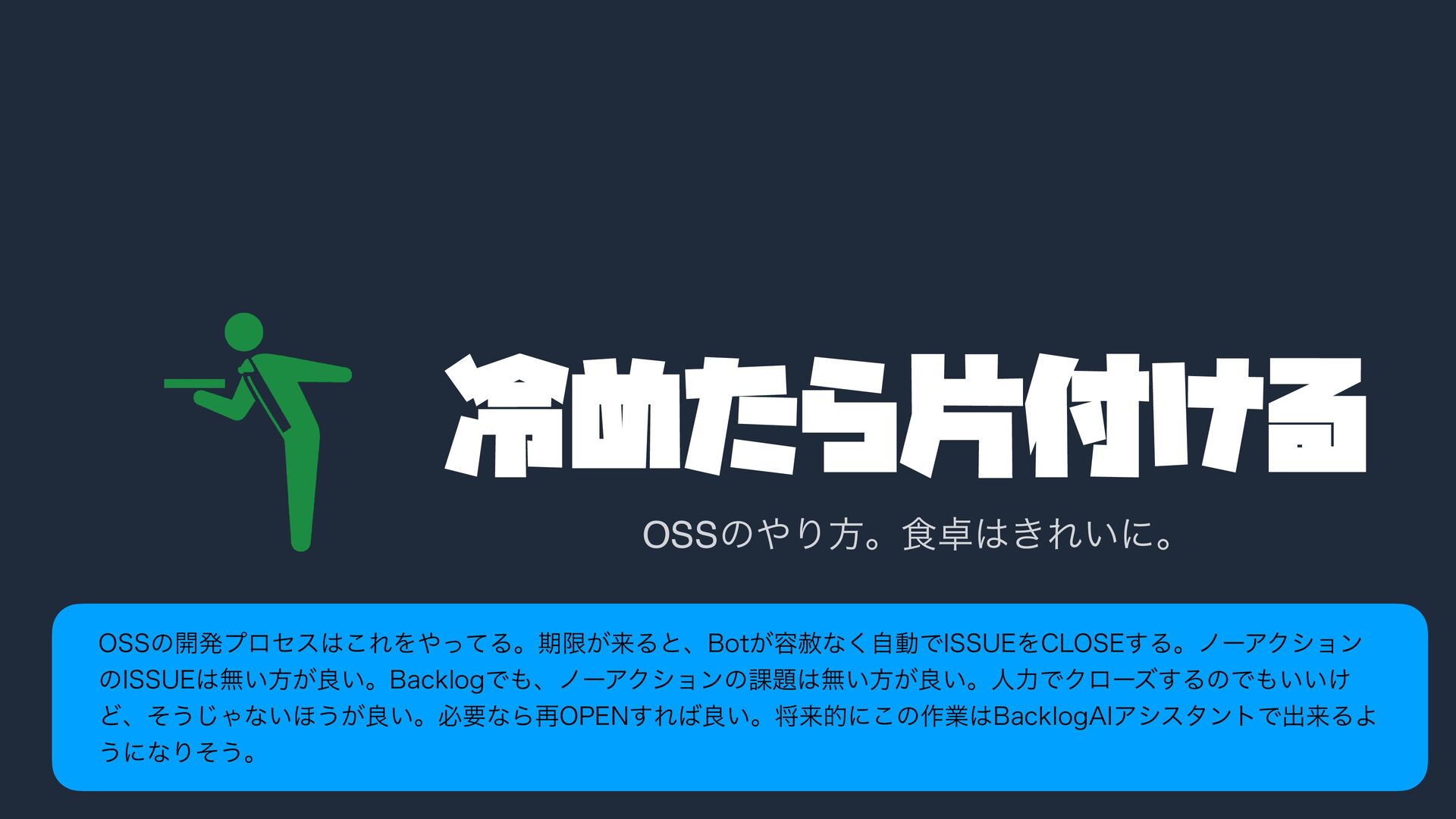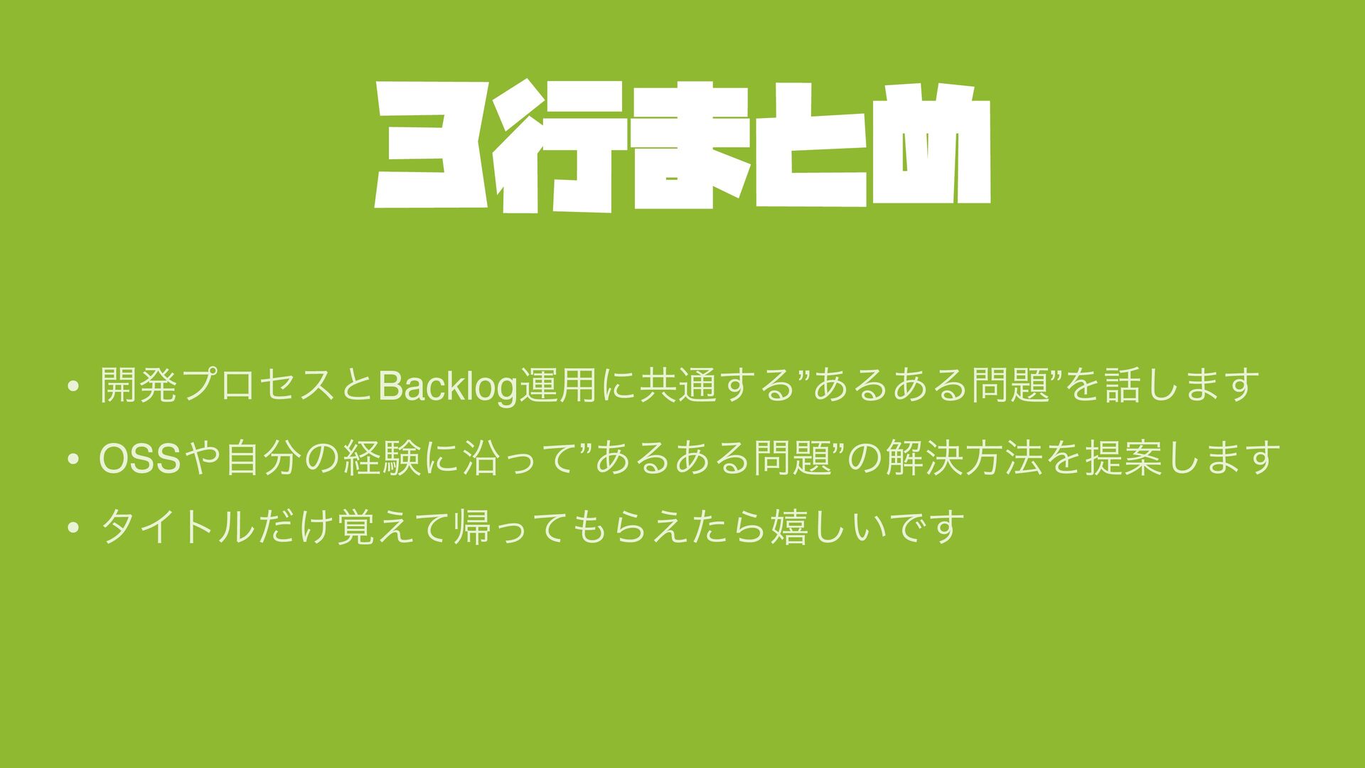 3行まとめ • ։ൃϓϩηεͱBacklogӡ༻ʹڞ௨͢Δ”͋Δ͋Δ”Λ͠·͢ • OSSࣗͷܦݧʹԊͬͯ”͋Δ͋Δ”ͷղܾํ๏ΛఏҊ͠·͢ • λΠτϧ͚֮ͩ͑ͯؼͬͯΒ͑ͨΒخ͍͠Ͱ͢