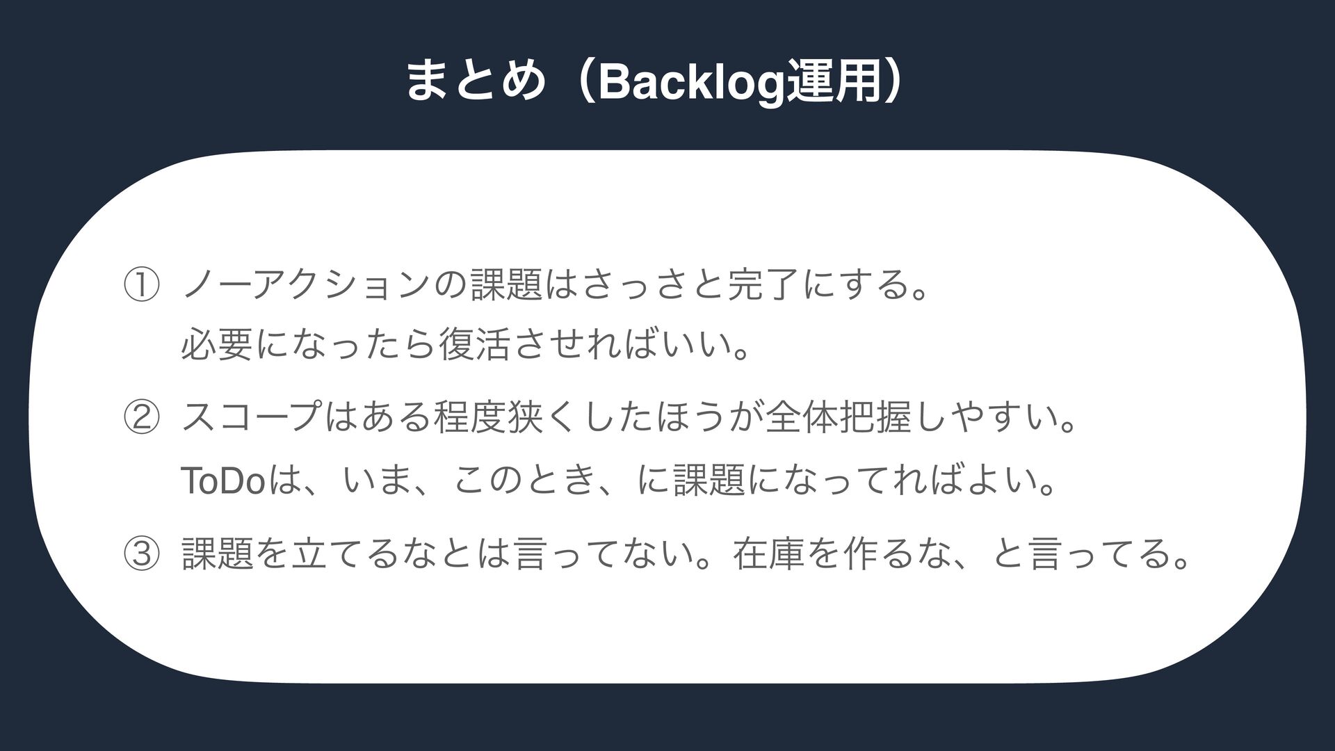 ᶃ ϊʔΞΫγϣϯͷ՝ͬ͞͞ͱྃʹ͢Δɻ ඞཁʹͳͬͨΒ෮׆ͤ͞Ε͍͍ɻ ᶄ είʔϓ͋Δఔڱͨ͘͠΄͏͕શମѲ͍͢͠ɻ ToDoɺ͍·ɺ͜ͷͱ͖ɺʹ՝ʹͳͬͯΕΑ͍ɻ ᶅ ՝ΛཱͯΔͳͱݴͬͯͳ͍ɻࡏݿΛ࡞ΔͳɺͱݴͬͯΔɻ ·ͱΊʢBacklogӡ༻ʣ