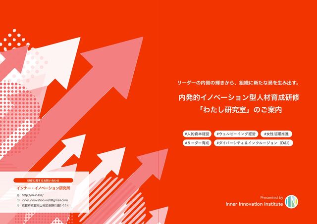 インナー・イノベーション研究所(IN)は、一人ひとりの潜在的な可能性を拓くことに寄り添い、組織のなかで可能性を発揮しあえるチームづくりを通して、内側から本質的に変容していく「内発的イノベーション」による人材育成と組織開発のあり方を探求していく研究機関として2021年に発足しました。個とチーム、さらに組織全体のアイデンティティを高めながら、相互に可能性を発揮しあえる組織風土を醸成する。その結果、個と全体の創造性を高め、イノベーションが生まれやすい土壌をつくることを目指したサービスを提供しています。