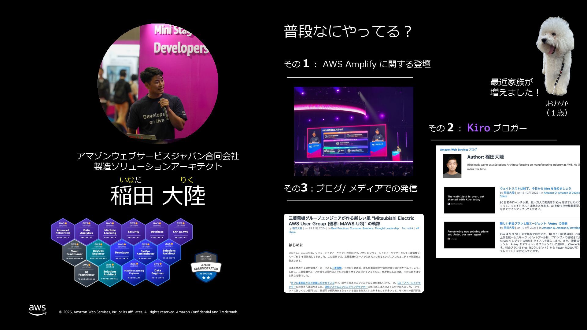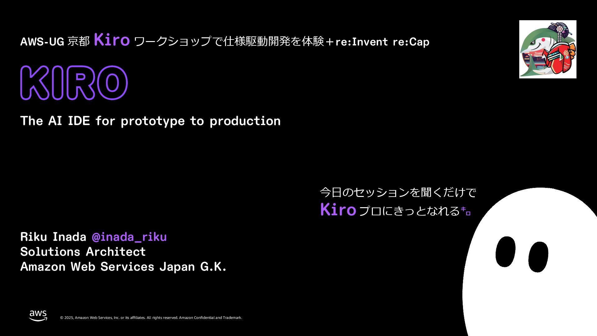 rights reserved. Amazon Confidential and Trademark. The AI IDE for prototype to production Speaker name (pronouns) AWS-UG 京都 Kiro ワークショップで仕様駆動開発を体験+re:Invent re:Cap Riku Inada @inada_riku Solutions Architect Amazon Web Services Japan G.K. 今⽇のセッションを聞くだけで Kiro プロにきっとなれる㌔