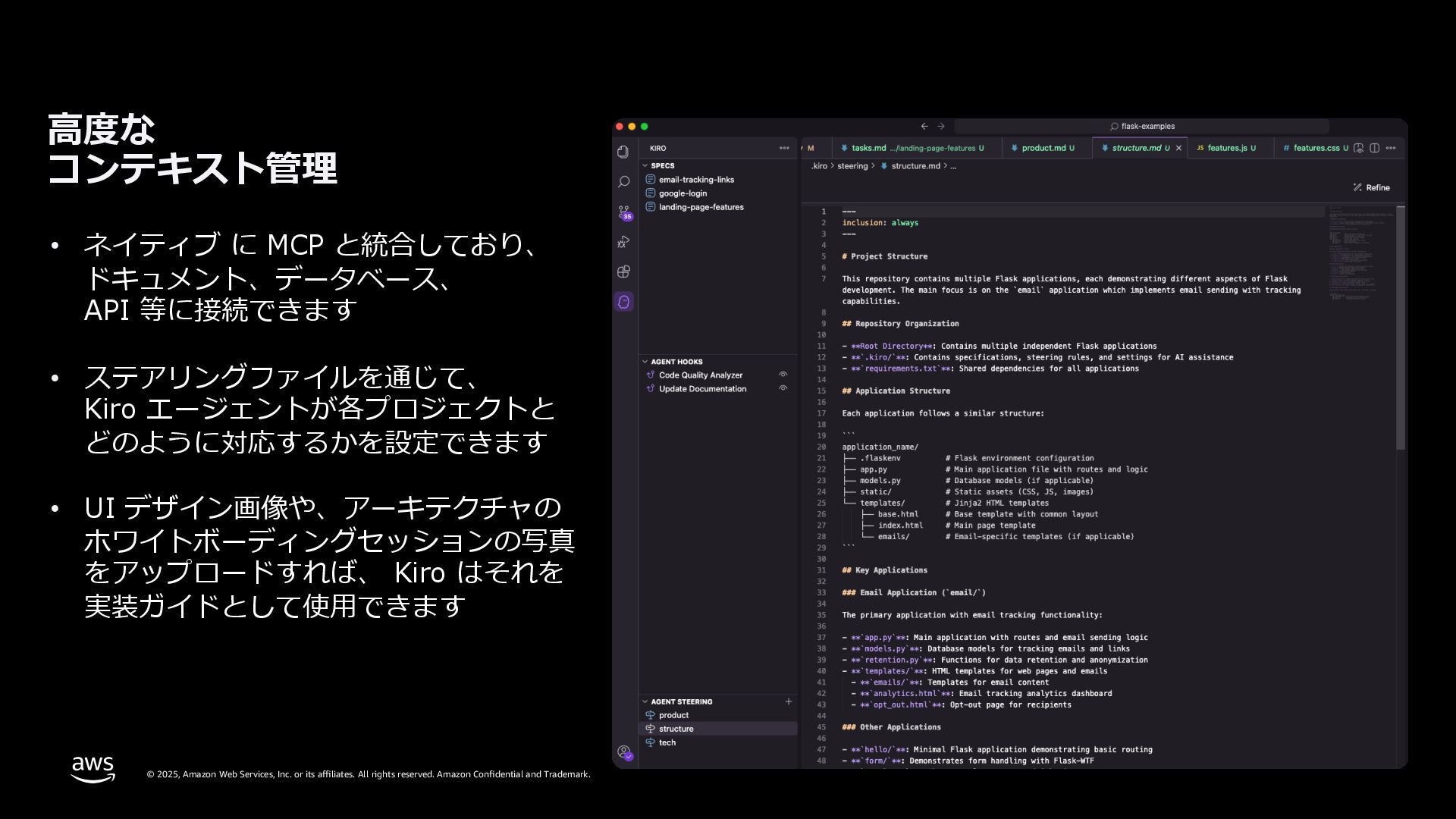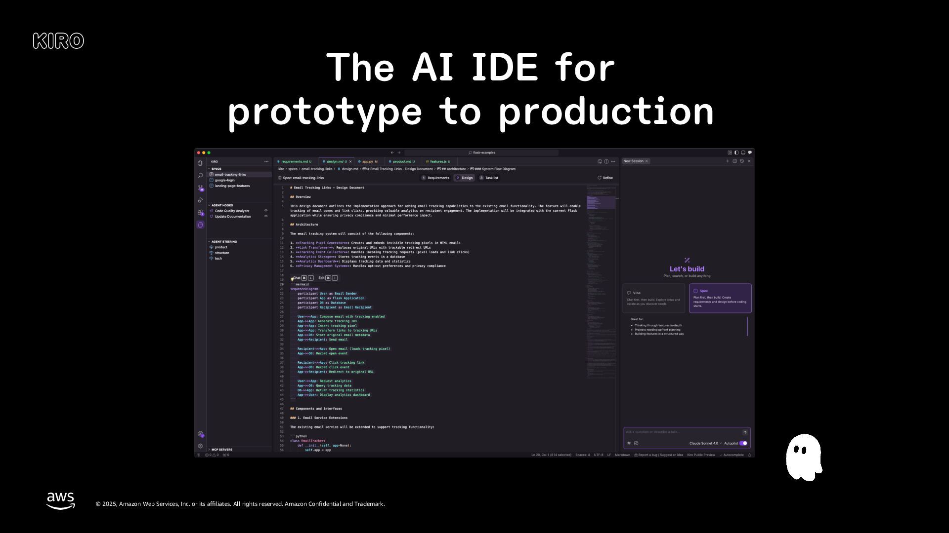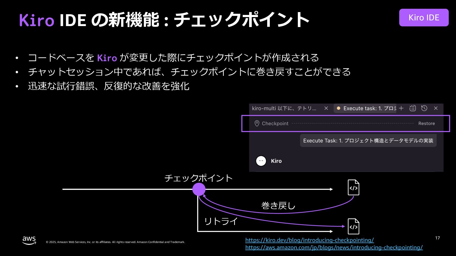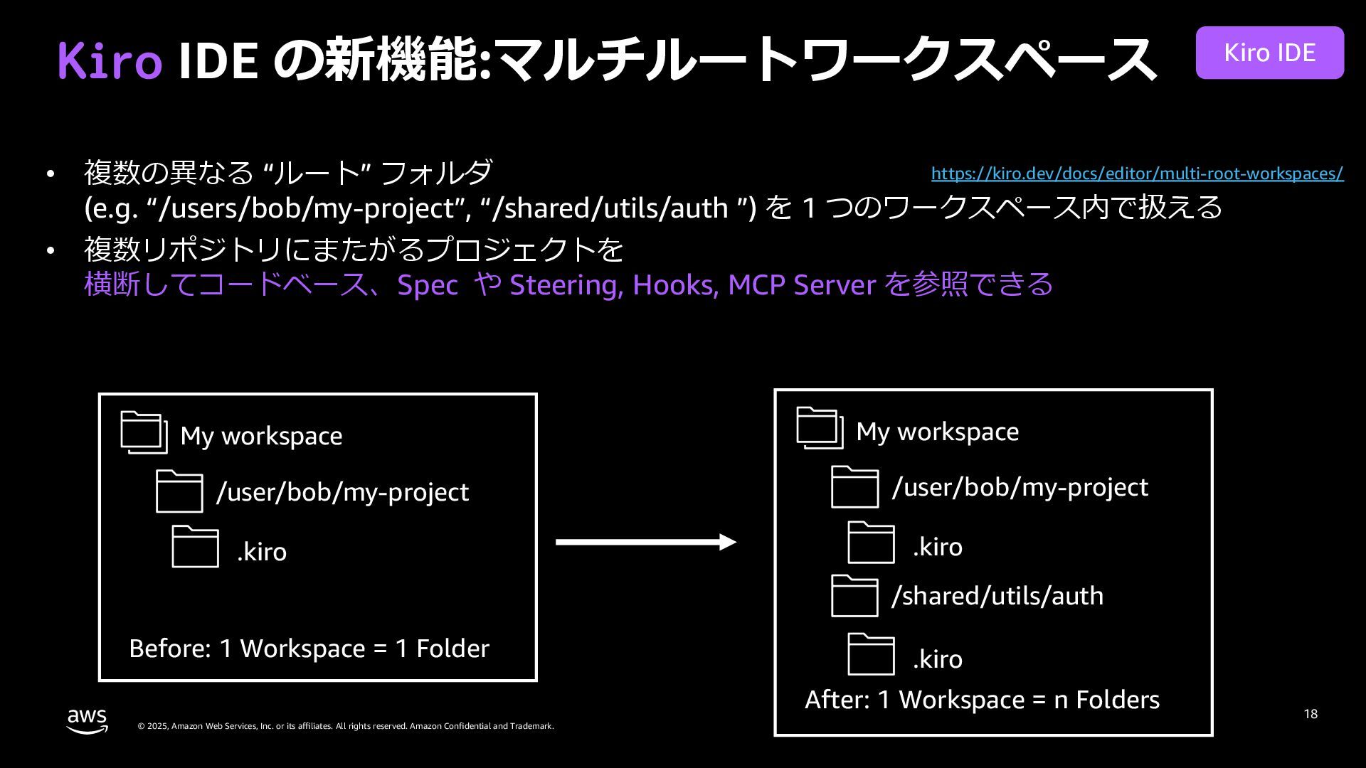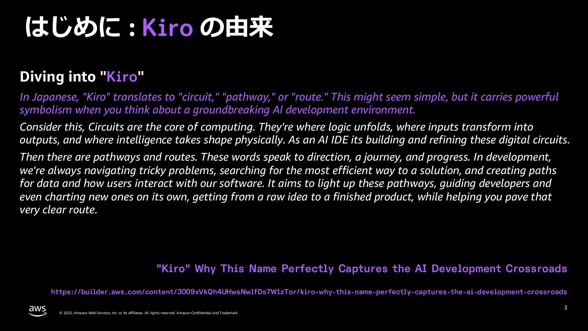 rights reserved. Amazon Confidential and Trademark. 3 はじめに : Kiro の由来 Diving into "Kiro" In Japanese, "Kiro" translates to "circuit," "pathway," or "route." This might seem simple, but it carries powerful symbolism when you think about a groundbreaking AI development environment. Consider this, Circuits are the core of computing. They're where logic unfolds, where inputs transform into outputs, and where intelligence takes shape physically. As an AI IDE its building and refining these digital circuits. Then there are pathways and routes. These words speak to direction, a journey, and progress. In development, we're always navigating tricky problems, searching for the most efficient way to a solution, and creating paths for data and how users interact with our software. It aims to light up these pathways, guiding developers and even charting new ones on its own, getting from a raw idea to a finished product, while helping you pave that very clear route. "Kiro" Why This Name Perfectly Captures the AI Development Crossroads https://builder.aws.com/content/3009xVkQh4UHwsNwlfDs7W1zTor/kiro-why-this-name-perfectly-captures-the-ai-development-crossroads