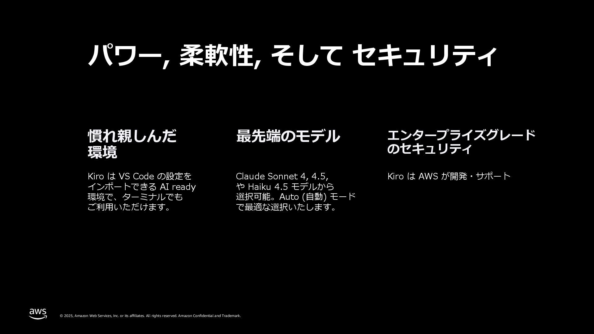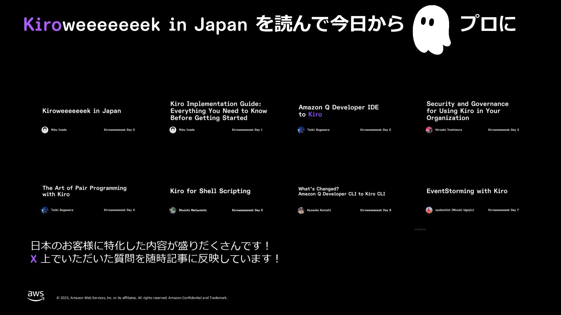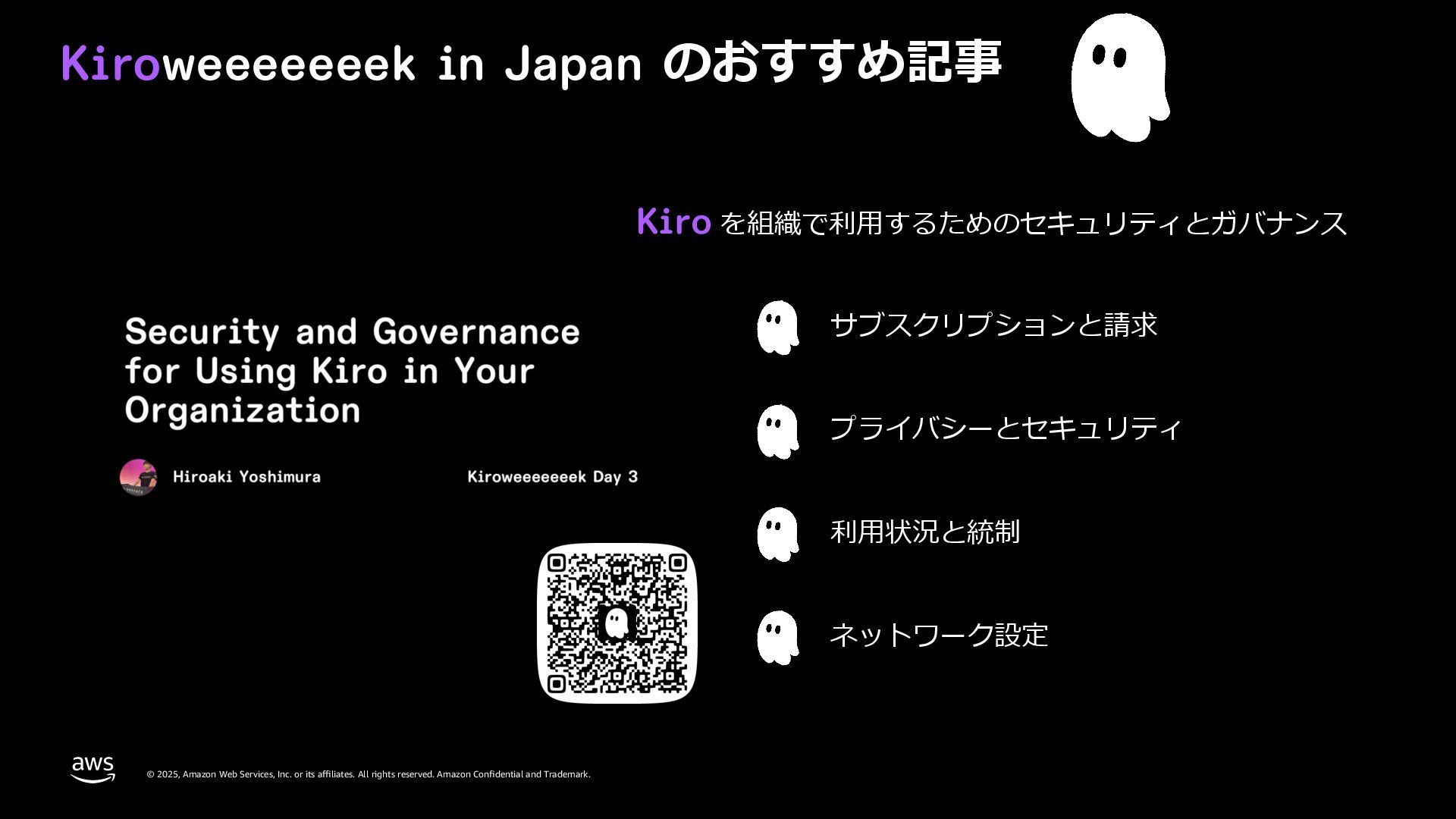 rights reserved. Amazon Confidential and Trademark. Kiroweeeeeeek in Japan のおすすめ記事 Kiro を組織で利⽤するためのセキュリティとガバナンス サブスクリプションと請求 プライバシーとセキュリティ 利⽤状況と統制 ネットワーク設定