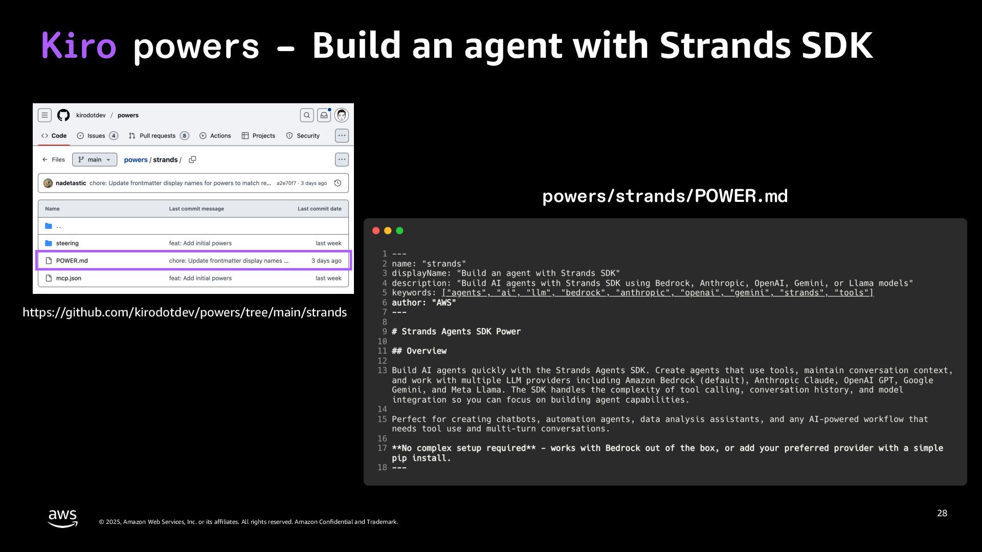 rights reserved. Amazon Confidential and Trademark. 28 Kiro powers – Build an agent with Strands SDK https://github.com/kirodotdev/powers/tree/main/strands powers/strands/POWER.md