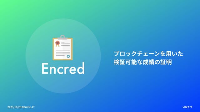 ブロックチェーンを用いた 検証可能な成績の証明 いなたつ 2023/10/28 Nemtus LT
