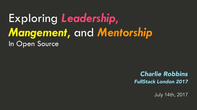 Leadership. Management. Mentorship. When considering decentralized Open Source projects all of these ideas come into play is a truly unique way. That is because of the nature of Open Source itself: self-motivation and self-determination. The individual has considerably more control over their own destiny with respect to what, why, and how they do work as a contributor when compared to "work" inside a more traditional corporate structure. Further there is often a disparity in goals between the create of an Open Source project and those who go on to maintain that same project months or years down the road.