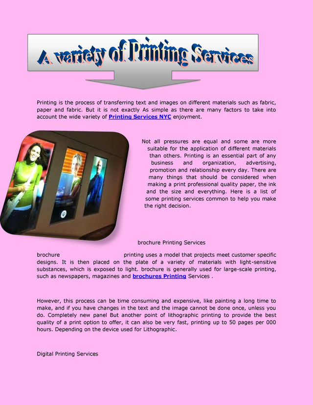 different materials such as fabric, paper and fabric. But it is not exactly As simple as there are many factors to take into account the wide variety of Printing Services NYC enjoyment. Not all pressures are equal and some are more suitable for the application of different materials than others. Printing is an essential part of any business and organization, advertising, promotion and relationship every day. There are many things that should be considered when making a print professional quality paper, the ink and the size and everything. Here is a list of some printing services common to help you make the right decision. brochure Printing Services brochure printing uses a model that projects meet customer specific designs. It is then placed on the plate of a variety of materials with light-sensitive substances, which is exposed to light. brochure is generally used for large-scale printing, such as newspapers, magazines and brochures Printing Services . However, this process can be time consuming and expensive, like painting a long time to make, and if you have changes in the text and the image cannot be done once, unless you do. Completely new panel But another point of lithographic printing to provide the best quality of a print option to offer, it can also be very fast, printing up to 50 pages per 000 hours. Depending on the device used for Lithographic. Digital Printing Services