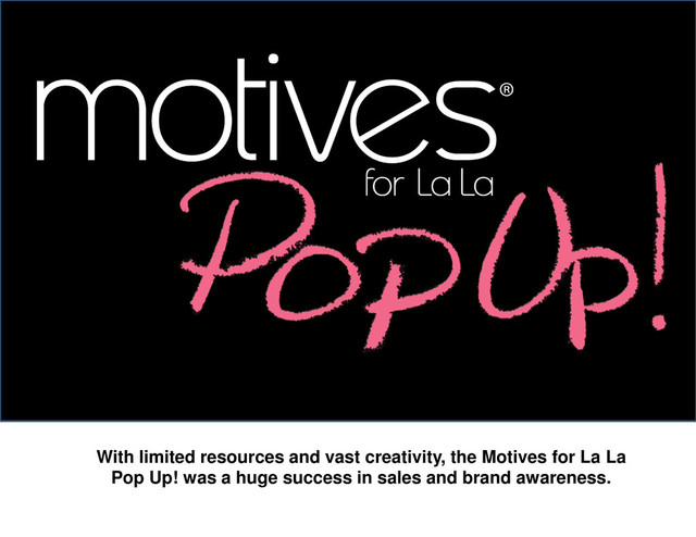 2 more intimate events focusing on the “individual” and catering to their makeup needs, all while planting seeds in potential distributors. Along with the social media push and one to one marketing we feel we will be able to move a substantial amount of product through the life of the Pop Up Shop. Popping Up in the next city, the Motives Pop Up team seeks to continue the development of the new product distribution outlet, giving us a formula to be duplicated city to city. Capitalizing on the success of the Atlanta launch and its seamless operation, it’s our charge to top ourselves!