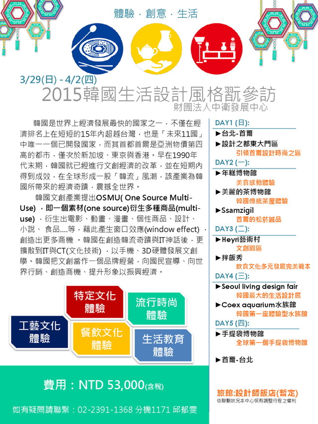 中衛中心邀請您參加<韓國生活設計風格翫參訪>之韓國觀摩團 台灣文創產業需要升級再升級,改變經營模式、新的創新服務、更多附加價值的創意,我們需要更寬廣的視野, 向韓國的進步學習,觀摩與國際同步的文創,這次的體驗希望對台灣文創產業將產生正面的影響。 衷心的希望創意生活業者可以抽空來參加,我們將擁有不一樣的經驗!