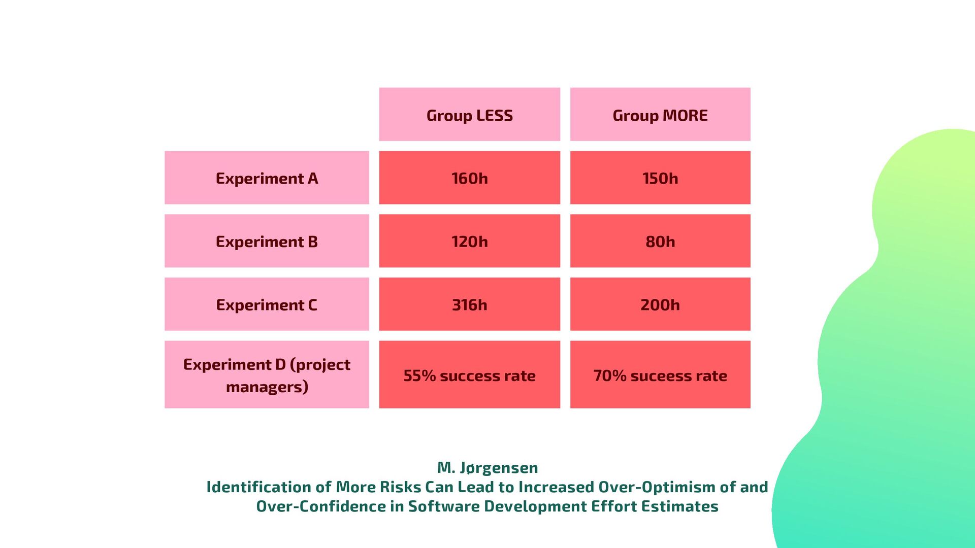 120h 80h Experiment C 316h 200h Experiment D (project managers) 55% success rate 70% suceess rate M. Jørgensen Identification of More Risks Can Lead to Increased Over-Optimism of and Over-Confidence in Software Development Effort Estimates