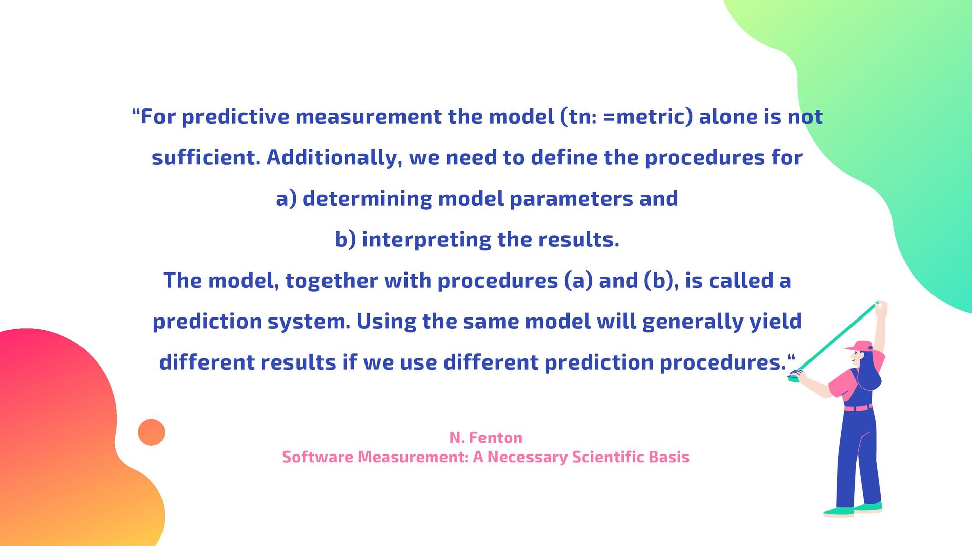 sufficient. Additionally, we need to define the procedures for a) determining model parameters and b) interpreting the results. The model, together with procedures (a) and (b), is called a prediction system. Using the same model will generally yield different results if we use different prediction procedures.“ N. Fenton Software Measurement: A Necessary Scientific Basis