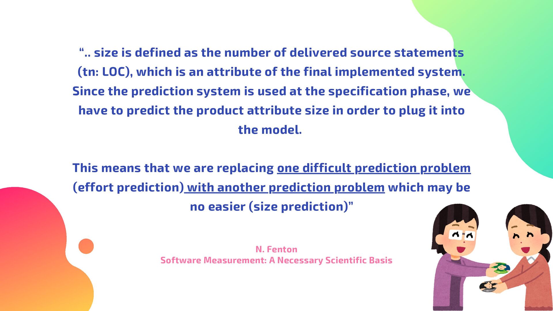 statements (tn: LOC), which is an attribute of the final implemented system. Since the prediction system is used at the specification phase, we have to predict the product attribute size in order to plug it into the model. This means that we are replacing one difficult prediction problem (effort prediction) with another prediction problem which may be no easier (size prediction)” N. Fenton Software Measurement: A Necessary Scientific Basis