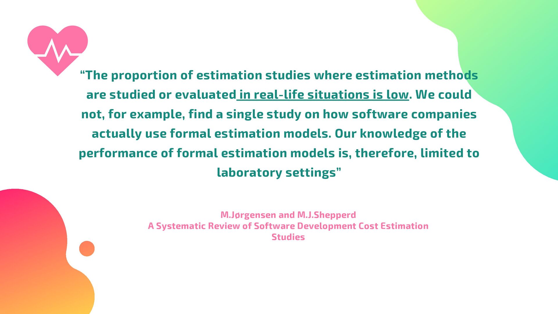 or evaluated in real-life situations is low. We could not, for example, find a single study on how software companies actually use formal estimation models. Our knowledge of the performance of formal estimation models is, therefore, limited to laboratory settings” M.Jørgensen and M.J.Shepperd A Systematic Review of Software Development Cost Estimation Studies