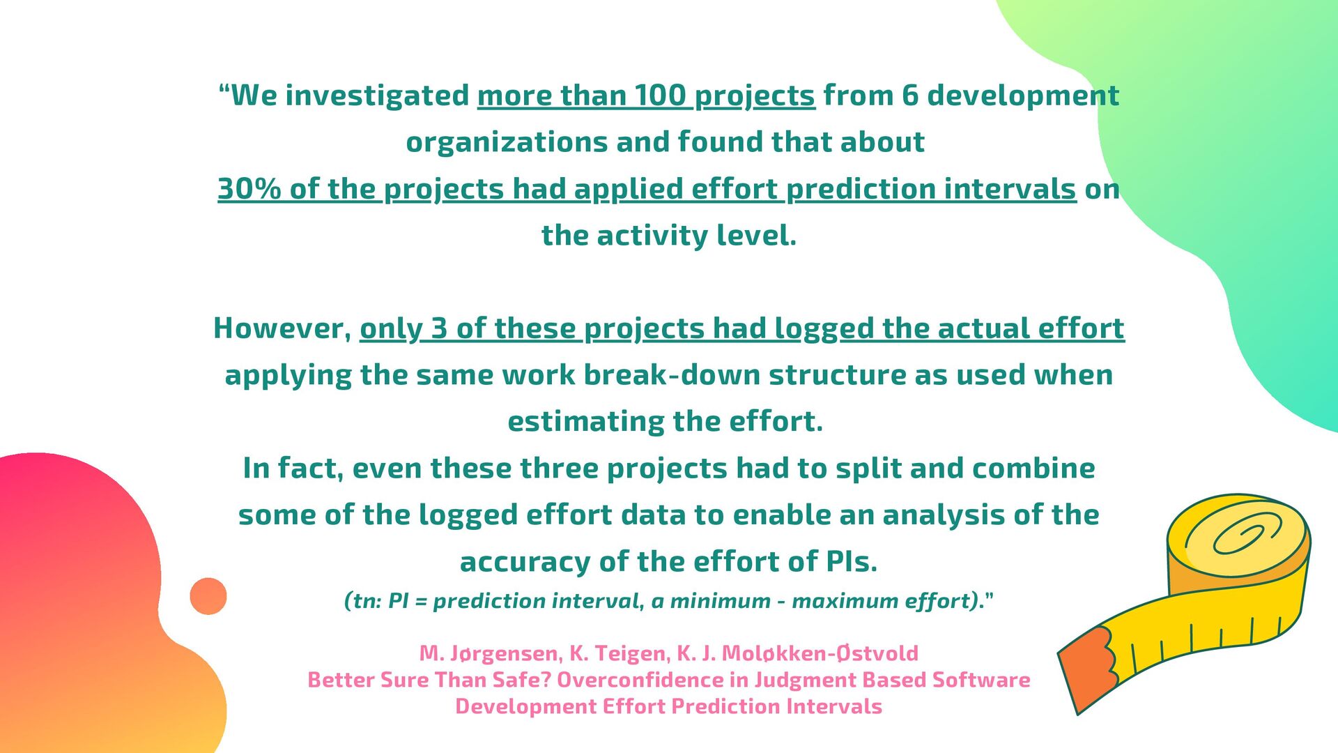and found that about 30% of the projects had applied effort prediction intervals on the activity level. However, only 3 of these projects had logged the actual effort applying the same work break-down structure as used when estimating the effort. In fact, even these three projects had to split and combine some of the logged effort data to enable an analysis of the accuracy of the effort of PIs. (tn: PI = prediction interval, a minimum - maximum effort).” M. Jørgensen, K. Teigen, K. J. Moløkken-Østvold Better Sure Than Safe? Overconfidence in Judgment Based Software Development Effort Prediction Intervals