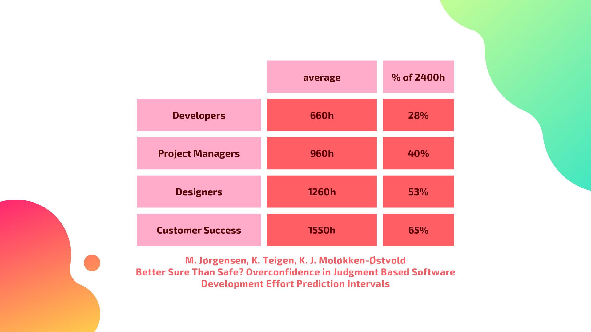 40% Designers 1260h 53% Customer Success 1550h 65% M. Jørgensen, K. Teigen, K. J. Moløkken-Østvold Better Sure Than Safe? Overconfidence in Judgment Based Software Development Effort Prediction Intervals