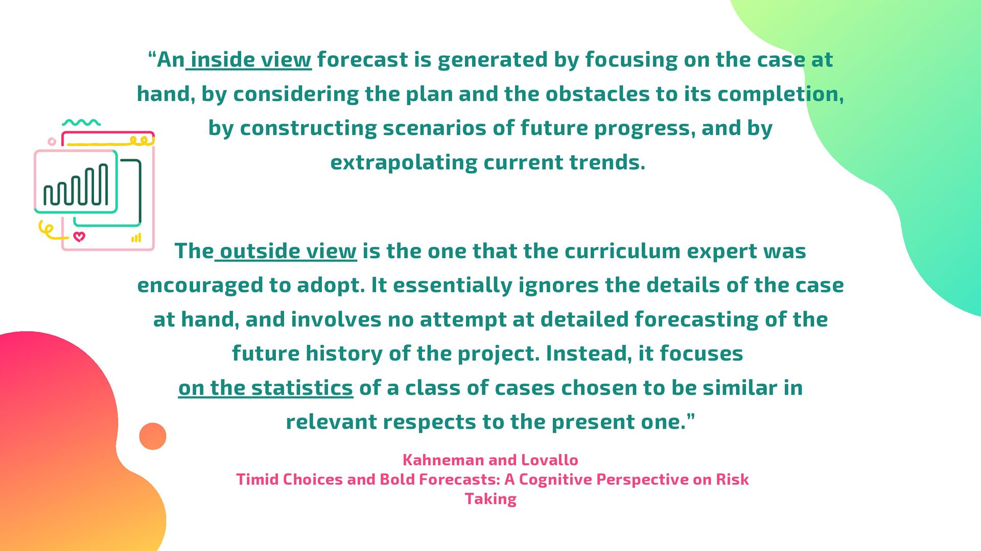 case at hand, by considering the plan and the obstacles to its completion, by constructing scenarios of future progress, and by extrapolating current trends. The outside view is the one that the curriculum expert was encouraged to adopt. It essentially ignores the details of the case at hand, and involves no attempt at detailed forecasting of the future history of the project. Instead, it focuses on the statistics of a class of cases chosen to be similar in relevant respects to the present one.” Kahneman and Lovallo Timid Choices and Bold Forecasts: A Cognitive Perspective on Risk Taking