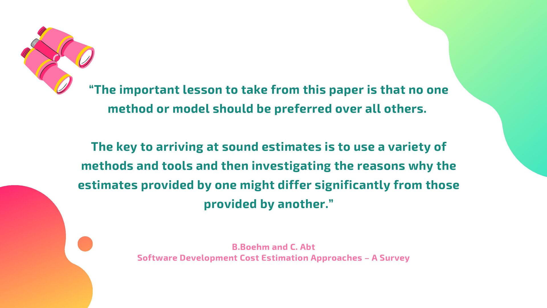 no one method or model should be preferred over all others. The key to arriving at sound estimates is to use a variety of methods and tools and then investigating the reasons why the estimates provided by one might differ significantly from those provided by another.” B.Boehm and C. Abt Software Development Cost Estimation Approaches – A Survey