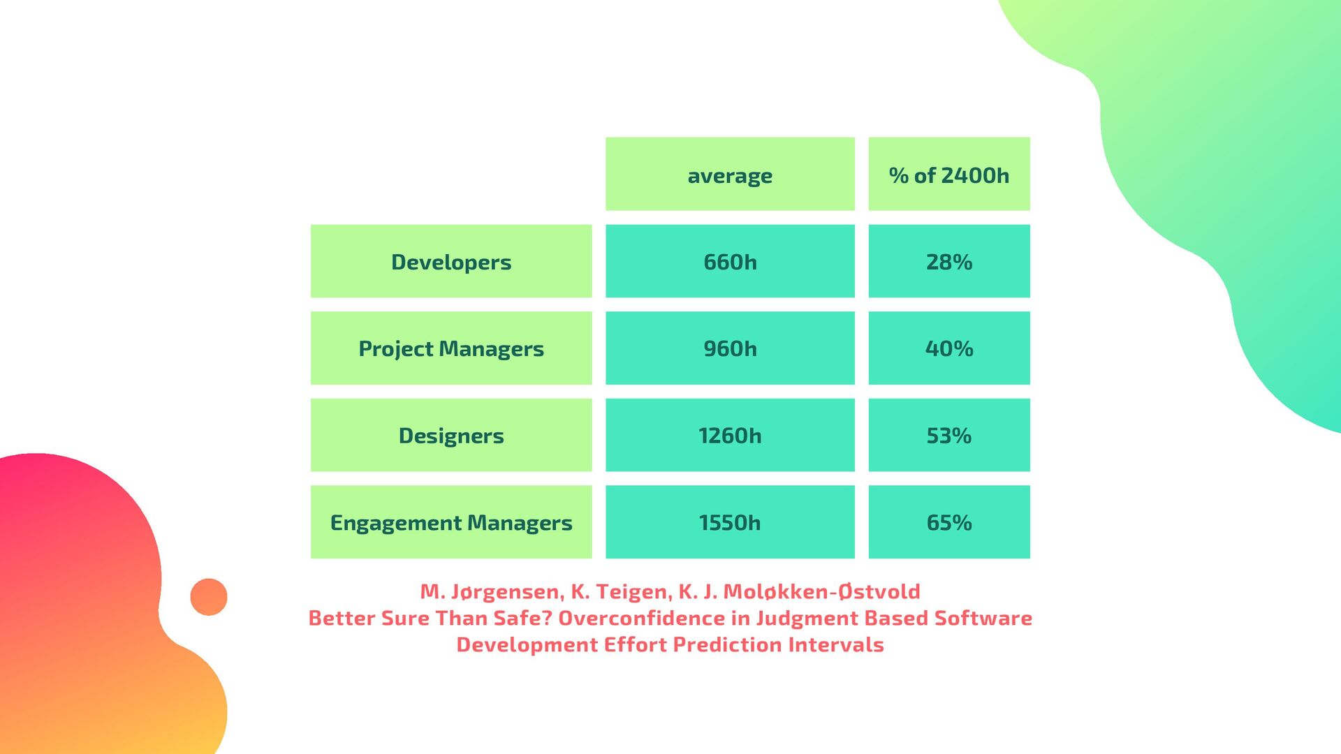 40% Designers 1260h 53% Engagement Managers 1550h 65% M. Jørgensen, K. Teigen, K. J. Moløkken-Østvold Better Sure Than Safe? Overconfidence in Judgment Based Software Development Effort Prediction Intervals