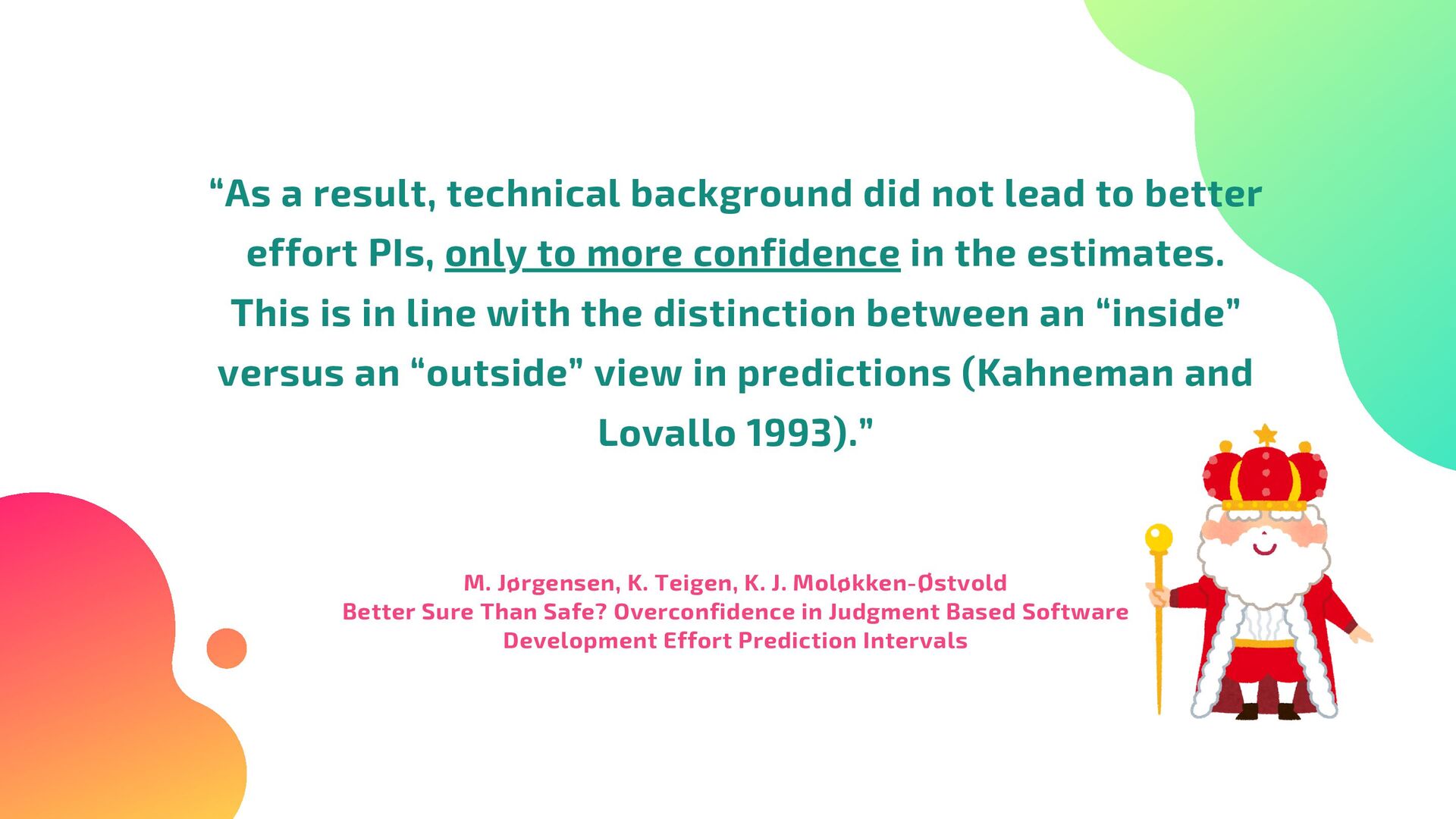 effort PIs, only to more confidence in the estimates. This is in line with the distinction between an “inside” versus an “outside” view in predictions (Kahneman and Lovallo 1993).” M. Jørgensen, K. Teigen, K. J. Moløkken-Østvold Better Sure Than Safe? Overconfidence in Judgment Based Software Development Effort Prediction Intervals