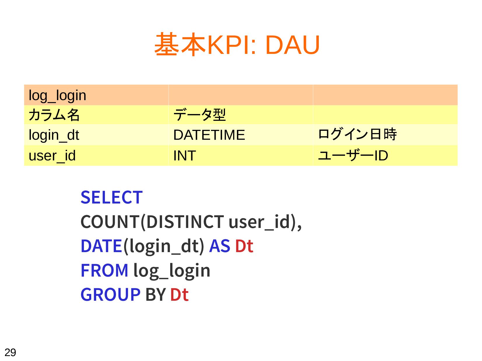 AS Uriage FROM tbl_receipt GROUP BY Dt, user_id ORDER BY Dt SELECT T.Dt AS Date, FLOOR(AVG(T.Uriage)) AS ARPPU FROM ( SELECT DATE(purchase_dt) AS Dt, user_id, SUM(unit_price) AS Uriage FROM tbl_receipt GROUP BY Dt,user_id ORDER BY Dt ) AS T GROUP BY Date 32