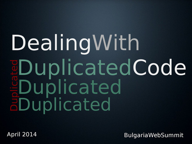 Slides for my presentation at Bulgaria Web Summit 2015 about Code Duplication, what it is, problems, how to find and how to deal with it.