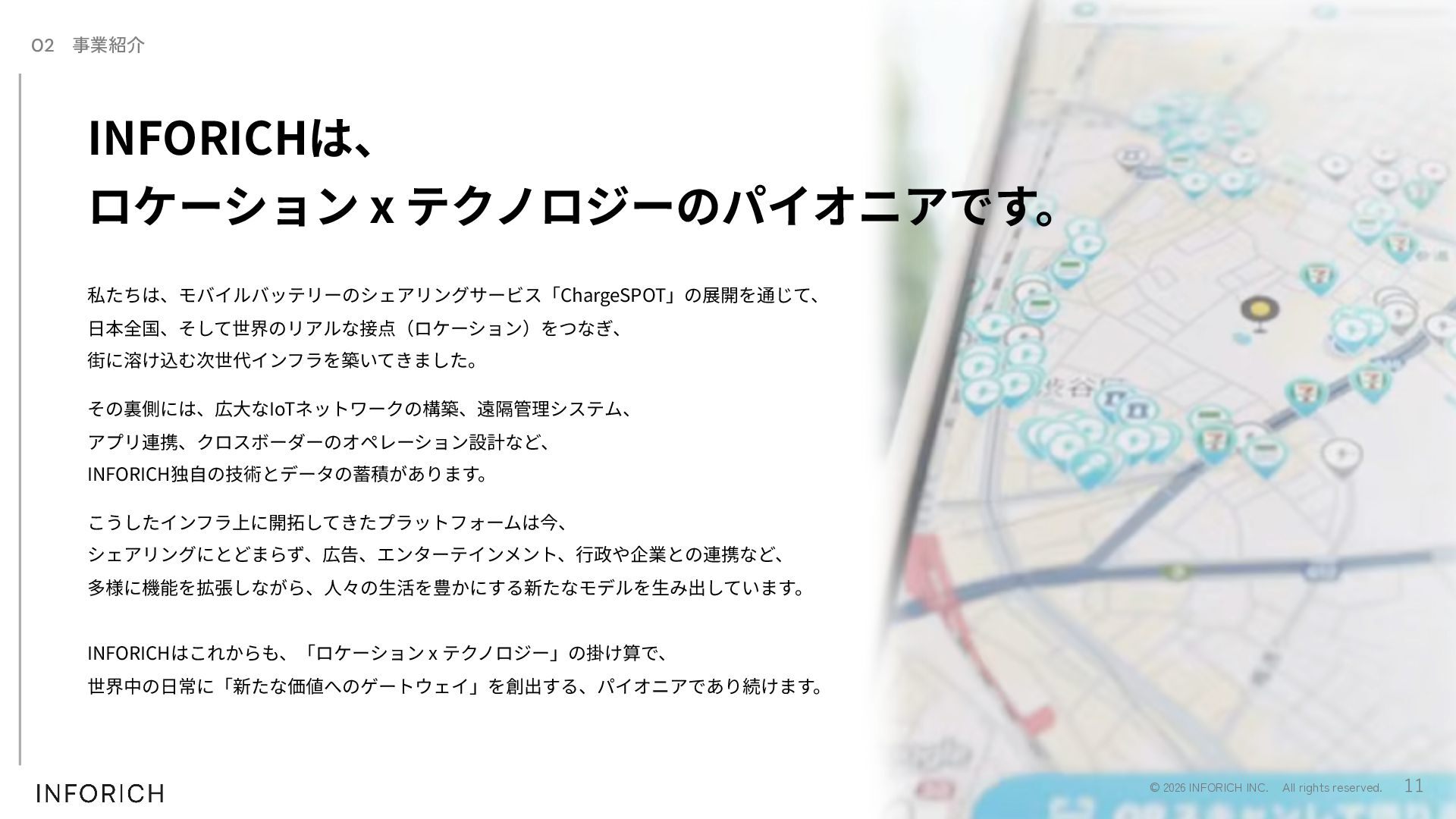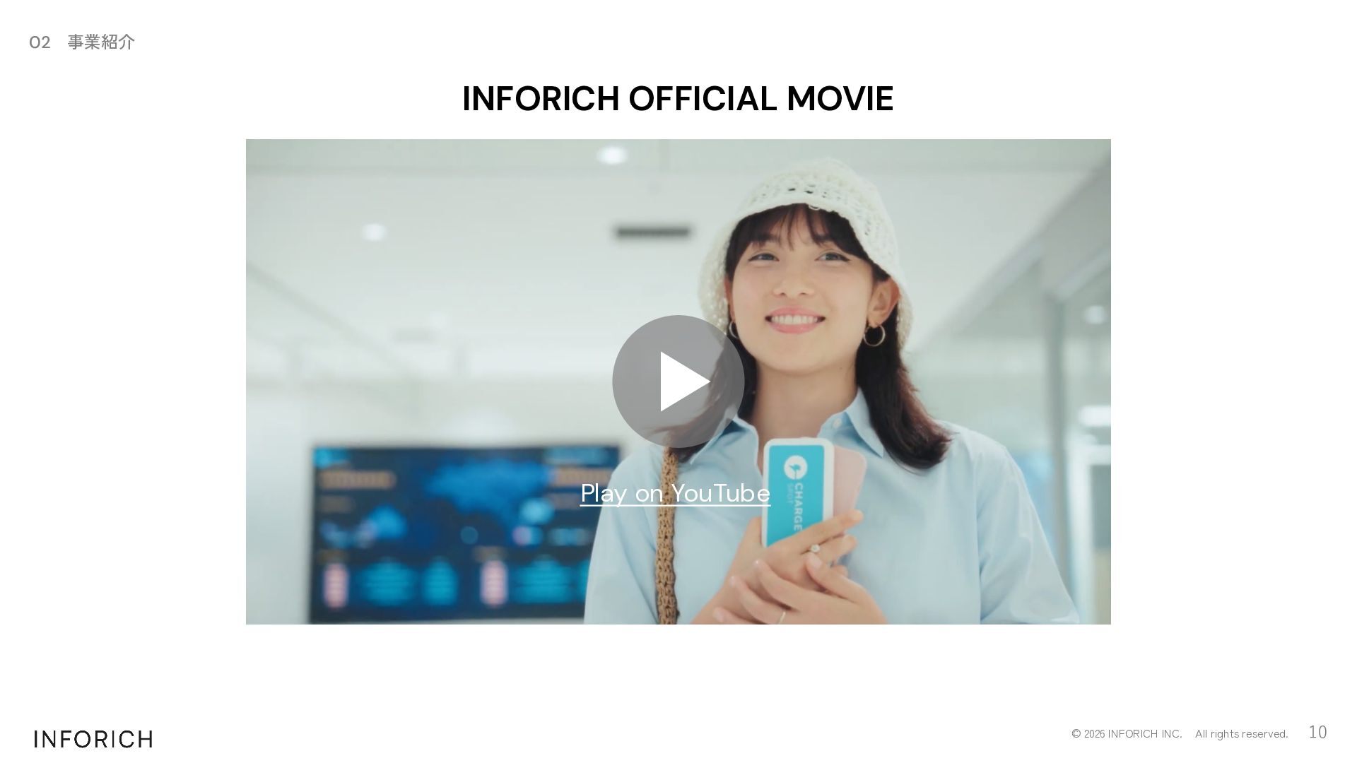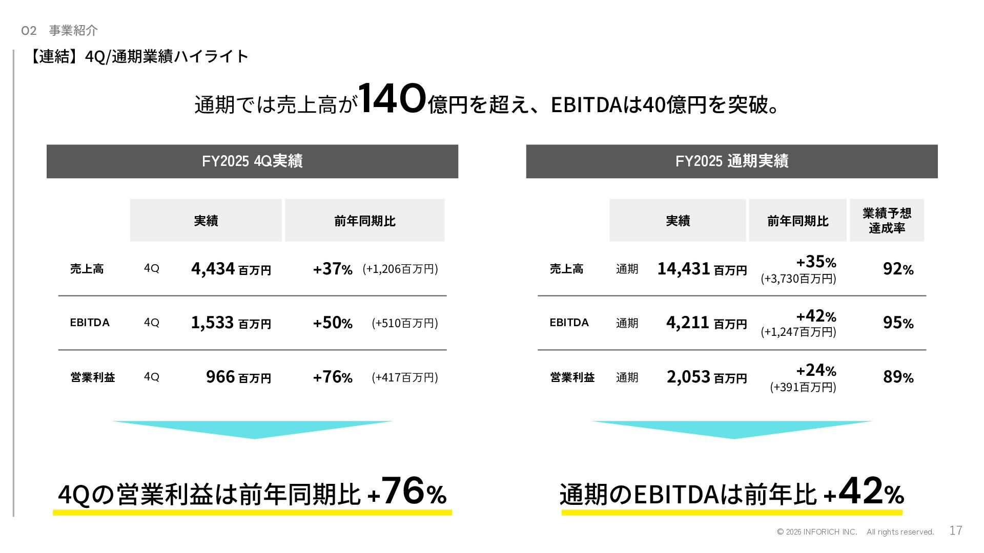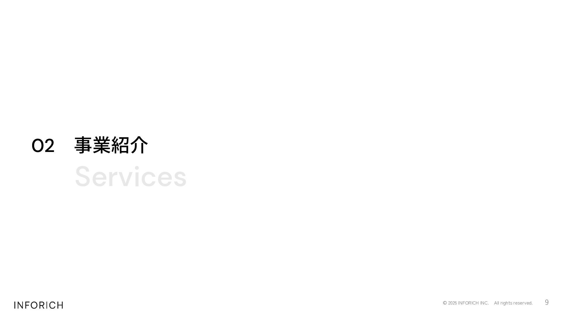 EBITDA +42% 実績 前年同期比 売上高 4Q 4,434 百万円 +37% (+1,206百万円) EBITDA 4Q 1,533 百万円 +50% (+510百万円) 営業利益 4Q 966 百万円 +76% (+417百万円) 実績 前年同期比 業績予想 達成率 売上高 14,431 +35% (+3,730 ) 92% EBITDA 4,211 +42% (+1,247 ) 95% 営業利益 2,053 +24% (+391 ) 89% © 2026 INFORICH INC. All rights reserved. 17 02 事業紹介