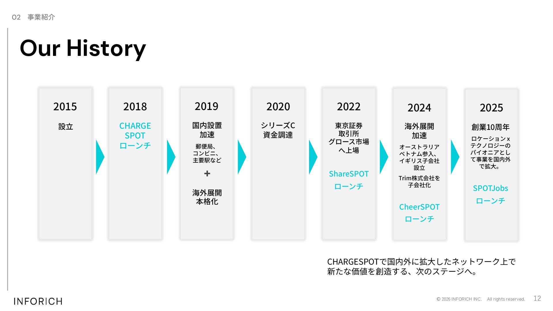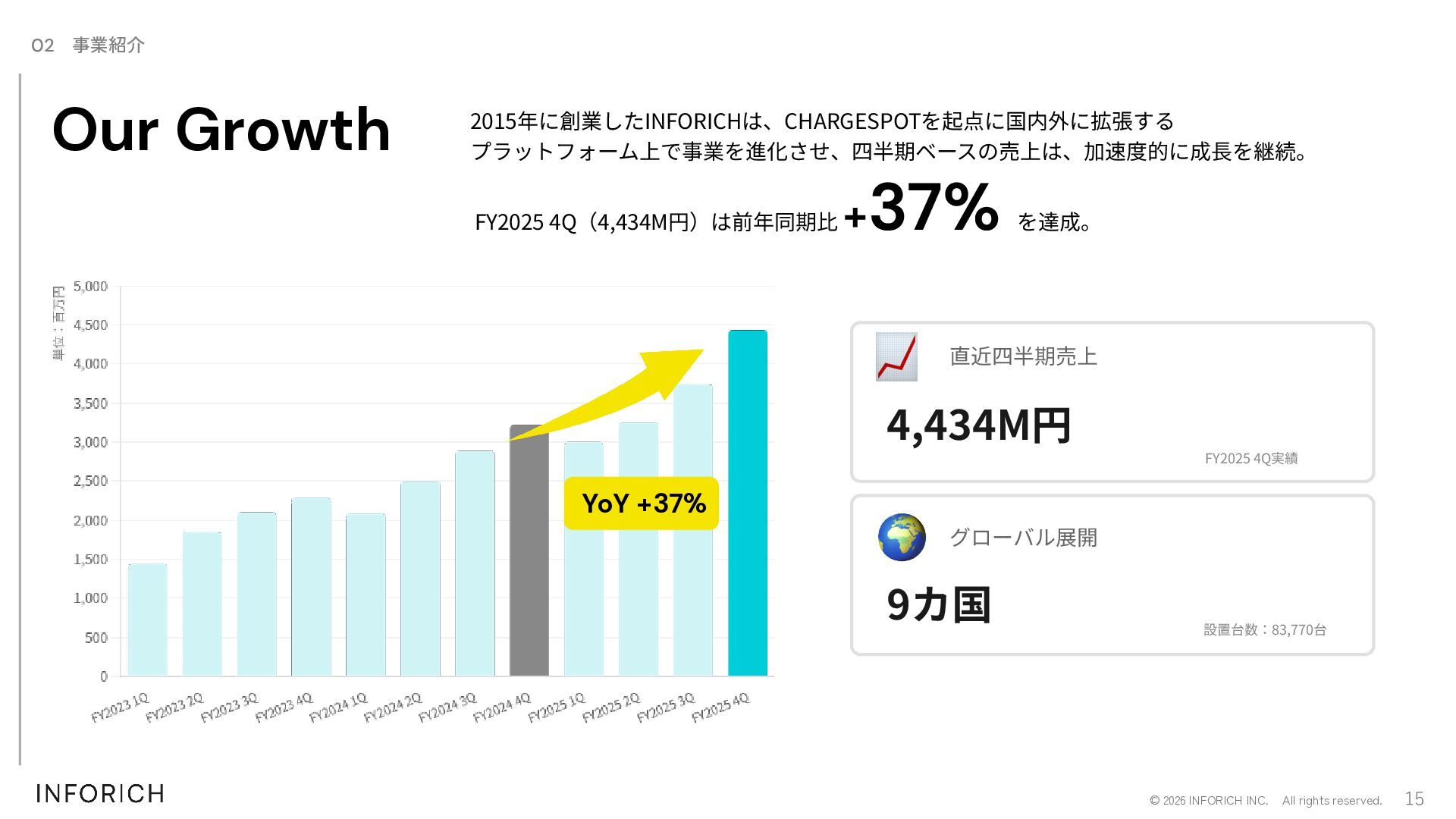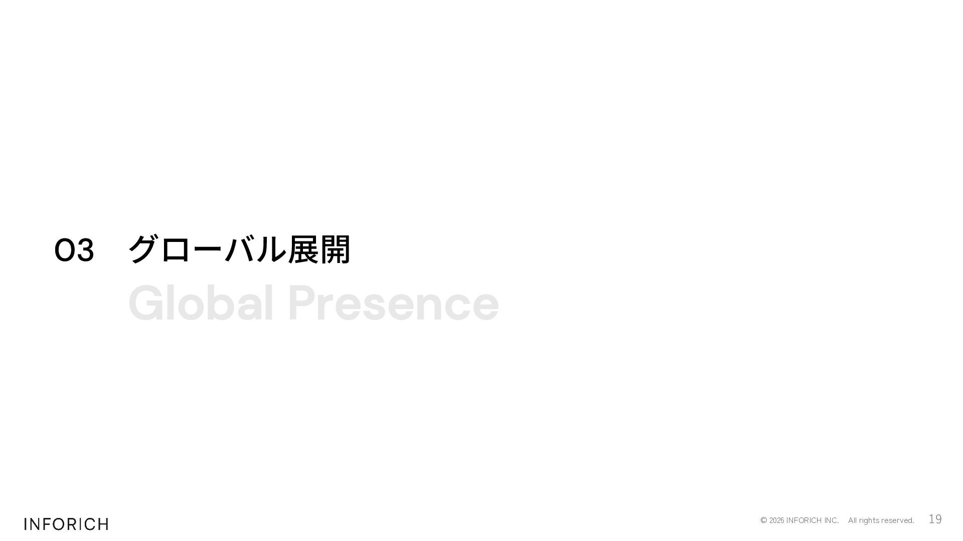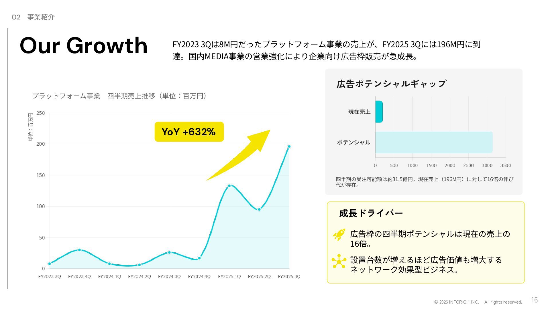 EBITDA +42% 実績 前年同期比 売上高 4Q 4,434 百万円 +37% (+1,206百万円) EBITDA 4Q 1,533 百万円 +50% (+510百万円) 営業利益 4Q 966 百万円 +76% (+417百万円) 実績 前年同期比 業績予想 達成率 売上高 14,431 +35% (+3,730 ) 92% EBITDA 4,211 +42% (+1,247 ) 95% 営業利益 2,053 +24% (+391 ) 89% © 2026 INFORICH INC. All rights reserved. 17 02 事業紹介