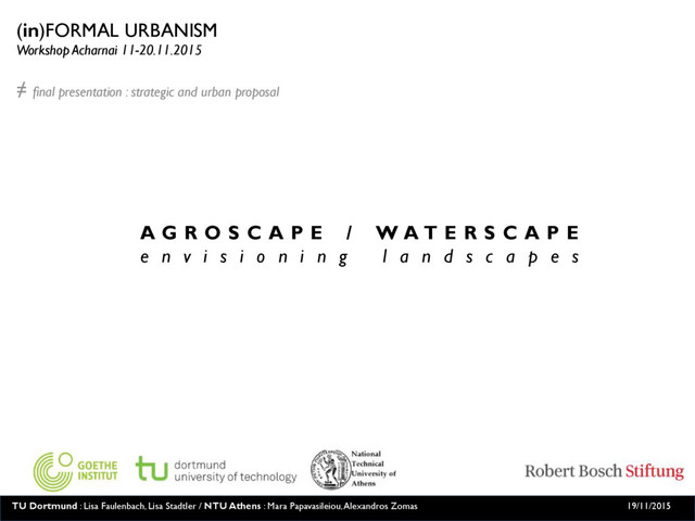 L S C A L E overall concept A G R O S C A P E / W A T E R S C A P E e n v i s i o n i n g l a n d s c a p e s How to introduce a g r i c u l t u r e as an element of a productive territory and a trigger of knowledge economy with tools such as: > u n i v e r s i t y o f i n n o v a t i v e a g r i c u l t u r e > e x p e r i m e n t a l u r b a n a g r i c u l t u r e l a b s > i n n o v a t i v e w a t e r m a n a g e m e n t s y s t e m > h o u s i n g t y p o l o g i e s b a s e d o n a g r i c u l t u r a l p l o t s TU Dortmund : Lisa Faulenbach, Lisa Stadtler / NTU Athens : Mara Papavasileiou, Alexandros Zomas 19/11/2015