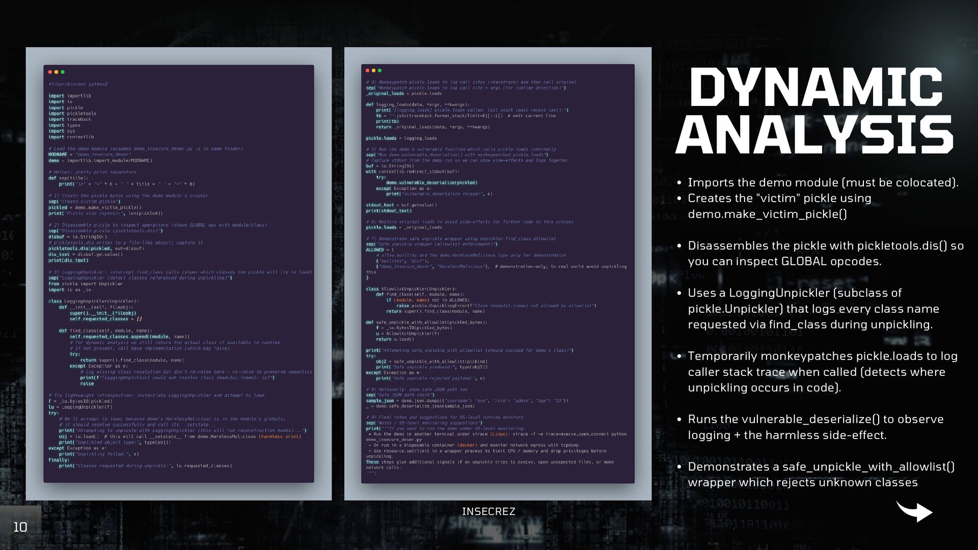 colocated). Creates the "victim" pickle using demo.make_victim_pickle() Disassembles the pickle with pickletools.dis() so you can inspect GLOBAL opcodes. Uses a LoggingUnpickler (subclass of pickle.Unpickler) that logs every class name requested via find_class during unpickling. Temporarily monkeypatches pickle.loads to log caller stack trace when called (detects where unpickling occurs in code). Runs the vulnerable_deserialize() to observe logging + the harmless side-effect. Demonstrates a safe_unpickle_with_allowlist() wrapper which rejects unknown classes