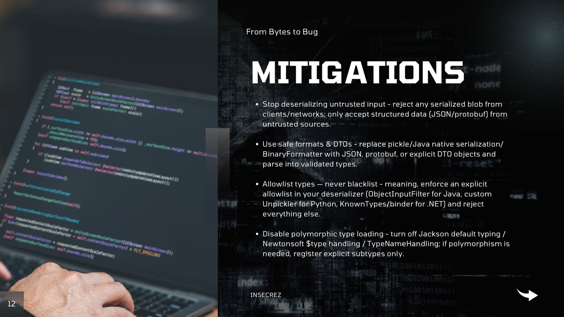 serialized blob from clients/networks; only accept structured data (JSON/protobuf) from untrusted sources. Use safe formats & DTOs - replace pickle/Java native serialization/ BinaryFormatter with JSON, protobuf, or explicit DTO objects and parse into validated types. Allowlist types — never blacklist - meaning, enforce an explicit allowlist in your deserializer (ObjectInputFilter for Java, custom Unpickler for Python, KnownTypes/binder for .NET) and reject everything else. Disable polymorphic type loading - turn off Jackson default typing / Newtonsoft $type handling / TypeNameHandling; if polymorphism is needed, register explicit subtypes only. From Bytes to Bug