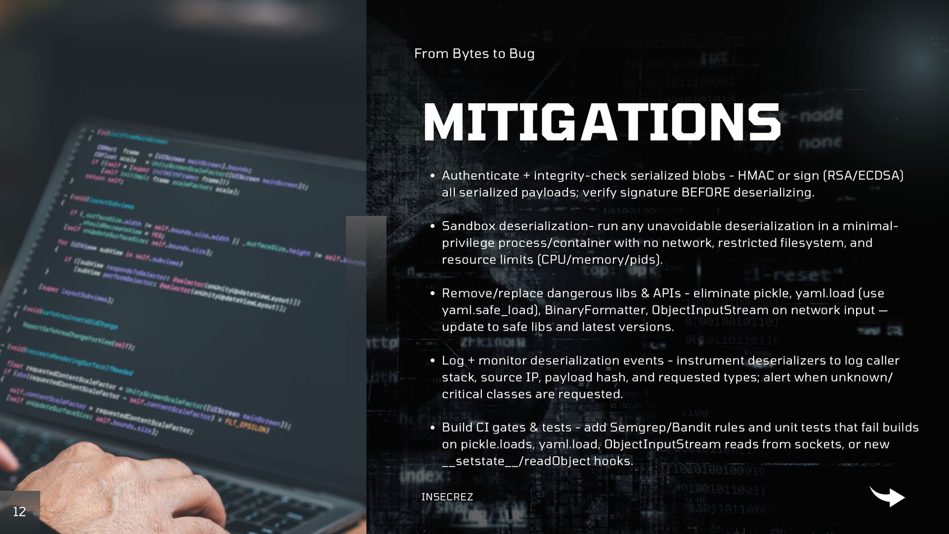 or sign (RSA/ECDSA) all serialized payloads; verify signature BEFORE deserializing. Sandbox deserialization- run any unavoidable deserialization in a minimal- privilege process/container with no network, restricted filesystem, and resource limits (CPU/memory/pids). Remove/replace dangerous libs & APIs - eliminate pickle, yaml.load (use yaml.safe_load), BinaryFormatter, ObjectInputStream on network input — update to safe libs and latest versions. Log + monitor deserialization events - instrument deserializers to log caller stack, source IP, payload hash, and requested types; alert when unknown/ critical classes are requested. Build CI gates & tests - add Semgrep/Bandit rules and unit tests that fail builds on pickle.loads, yaml.load, ObjectInputStream reads from sockets, or new __setstate__/readObject hooks. From Bytes to Bug