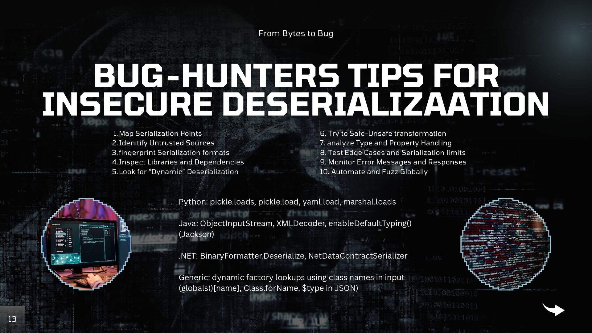 Untrusted Sources 3.fingerprint Serialization formats 4.Inspect Libraries and Dependencies 5.Look for “Dynamic” Deserialization From Bytes to Bug 6. Try to Safe-Unsafe transformation 7. analyze Type and Property Handling 8. Test Edge Cases and Serialization limits 9. Monitor Error Messages and Responses 10. Automate and Fuzz Globally Python: pickle.loads, pickle.load, yaml.load, marshal.loads Java: ObjectInputStream, XMLDecoder, enableDefaultTyping() (Jackson) .NET: BinaryFormatter.Deserialize, NetDataContractSerializer Generic: dynamic factory lookups using class names in input (globals()[name], Class.forName, $type in JSON)